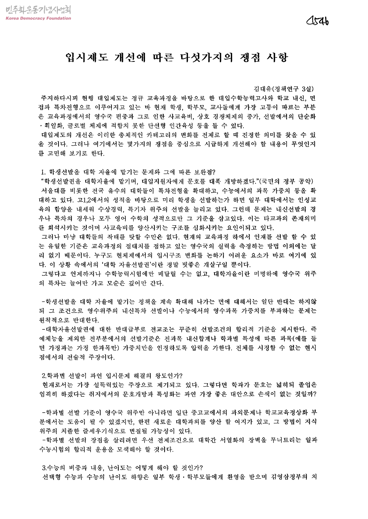 입시제도 개선에 따른 다섯가지의 쟁점 사항
