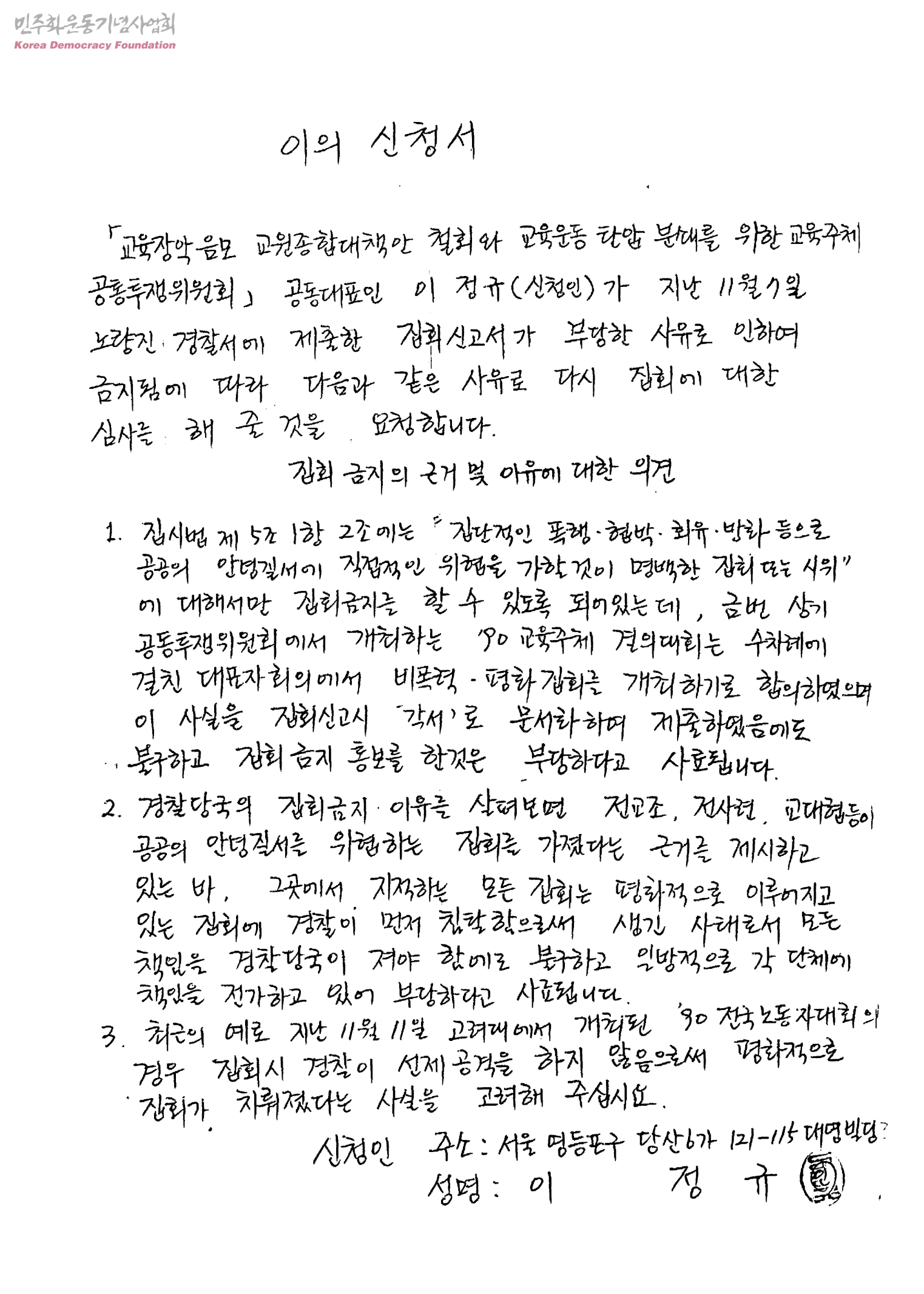 이의신청서[집회신고서 부당한 사유로 금지됨에 따라]