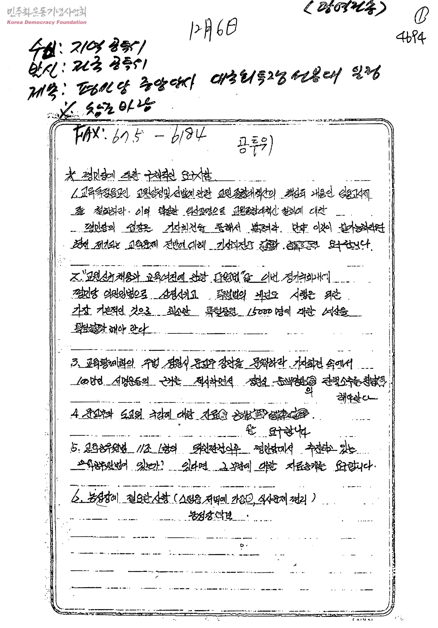 평민당 중앙당사 대국회투쟁 선봉대 일정[수신:지역 공투위, 발신:전국 공투위]