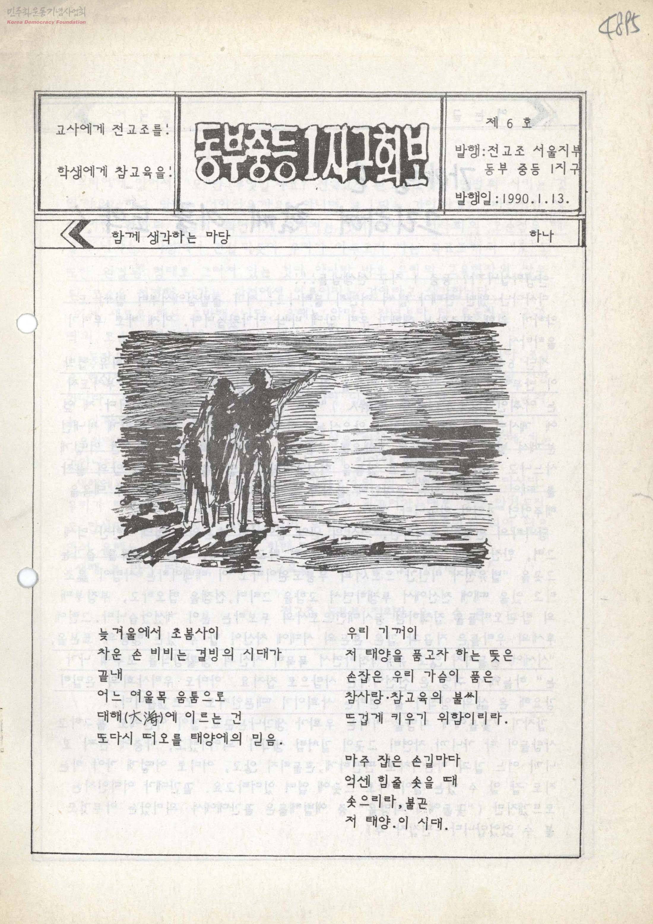 - 우리 사회의 민주화를 교실에서부터 시작해야 한다고 생각하여 교육민주화 운동을 전개하고 교육노동자의 권익향상을 위해 싸운 전교조 서울 동부중등1지구 소식지 여는 글-가야할 길 그리하여 함께 이룰 도약! 소식-전교조 힘 과시한 해고자 총단결 대회 소식-영화 상영 선생님 사랑합니다. 등