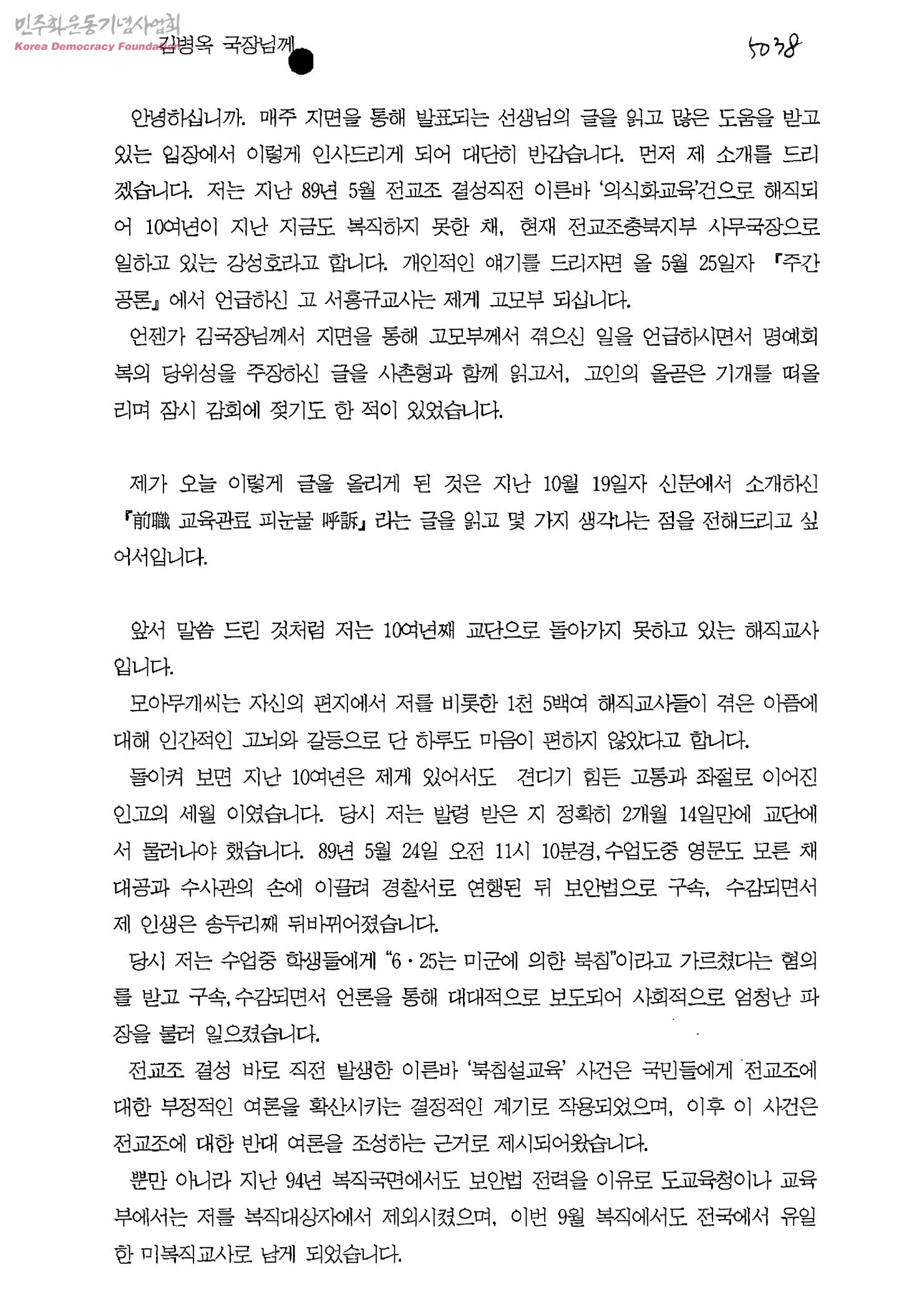 강성호가 김병옥 국장에게 보내는 편지
