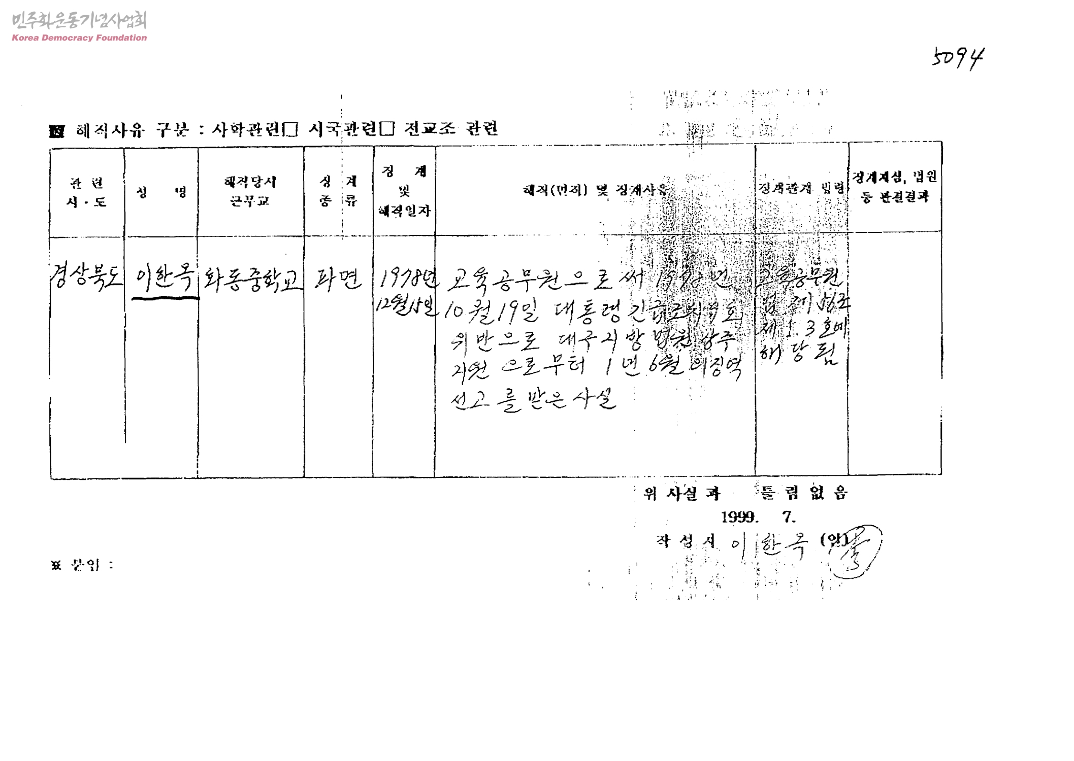 [해직교사 사유구분 및 실태조사]