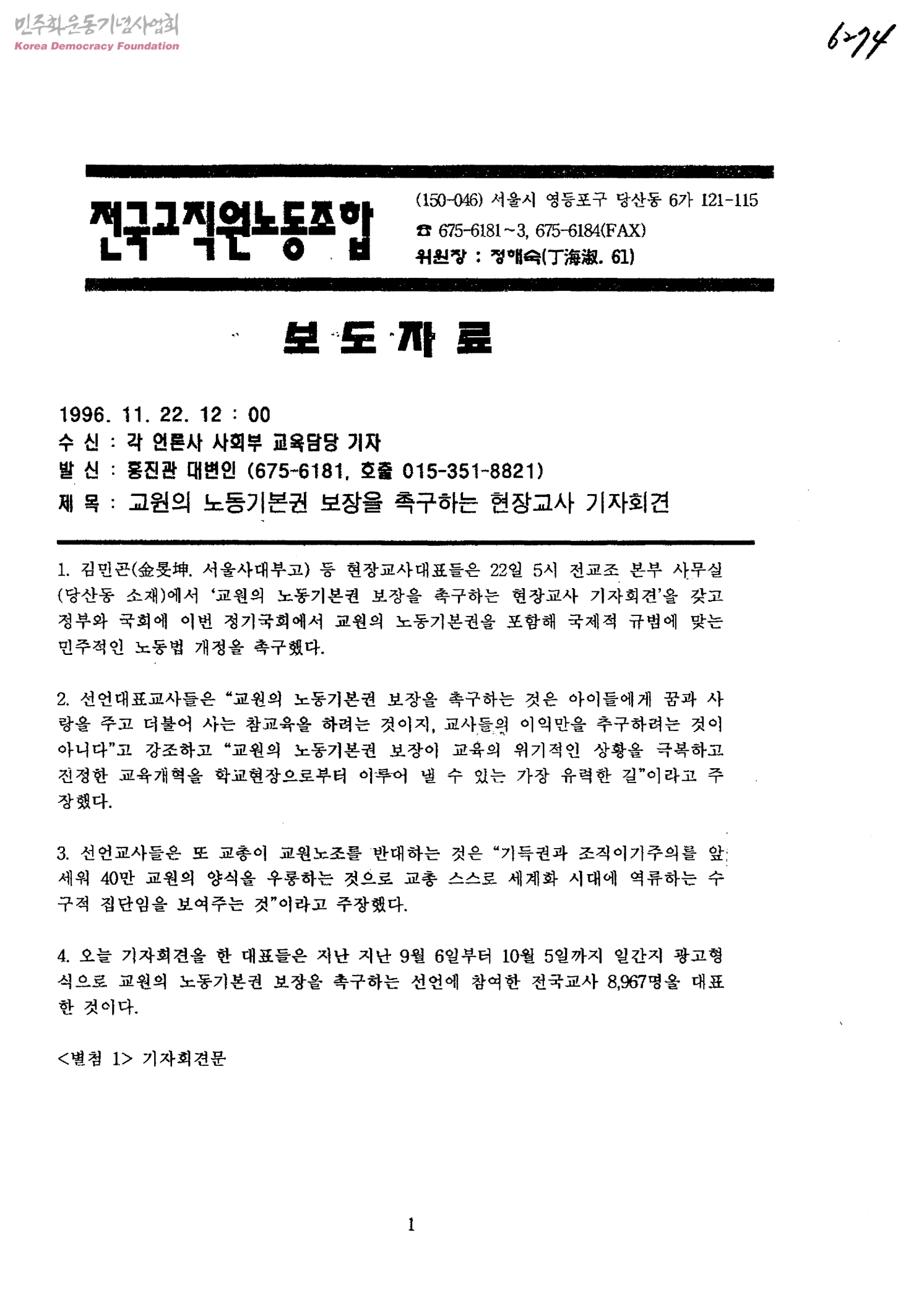 보도자료-교원의 노동기본권 보장을 촉구하는 현장교사 기자회견[수신:각 언론사 사회부 교육담당 기자, 발신:홍진관 대변인]