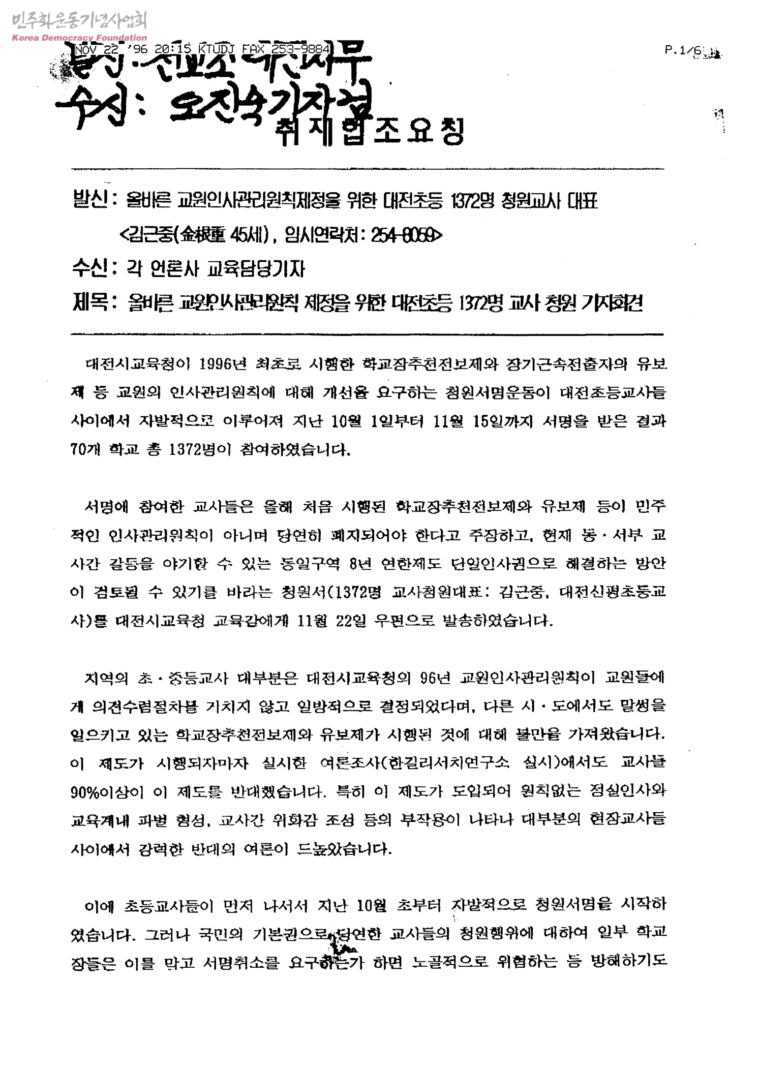 취재협조요청[수신:각 언론사 교육담당기자, 발신:올바른 교원인사관리원칙제정을 위한 대전초등 1372명 청원교사 대표]