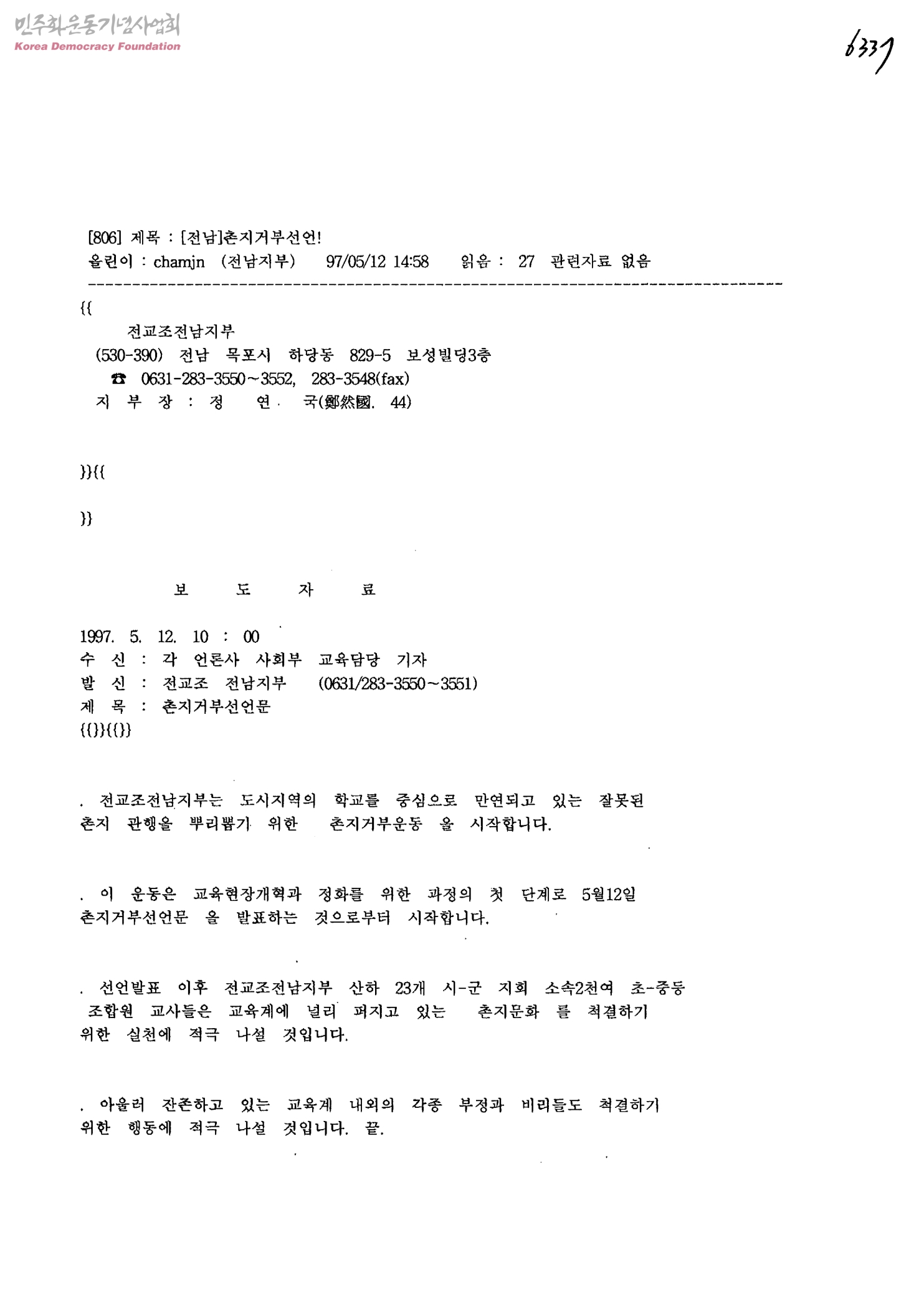 보도자료-촌지거부선언문[수신:각 언론사 사회부 교육담당 기자, 발신:전교조 전남지부]