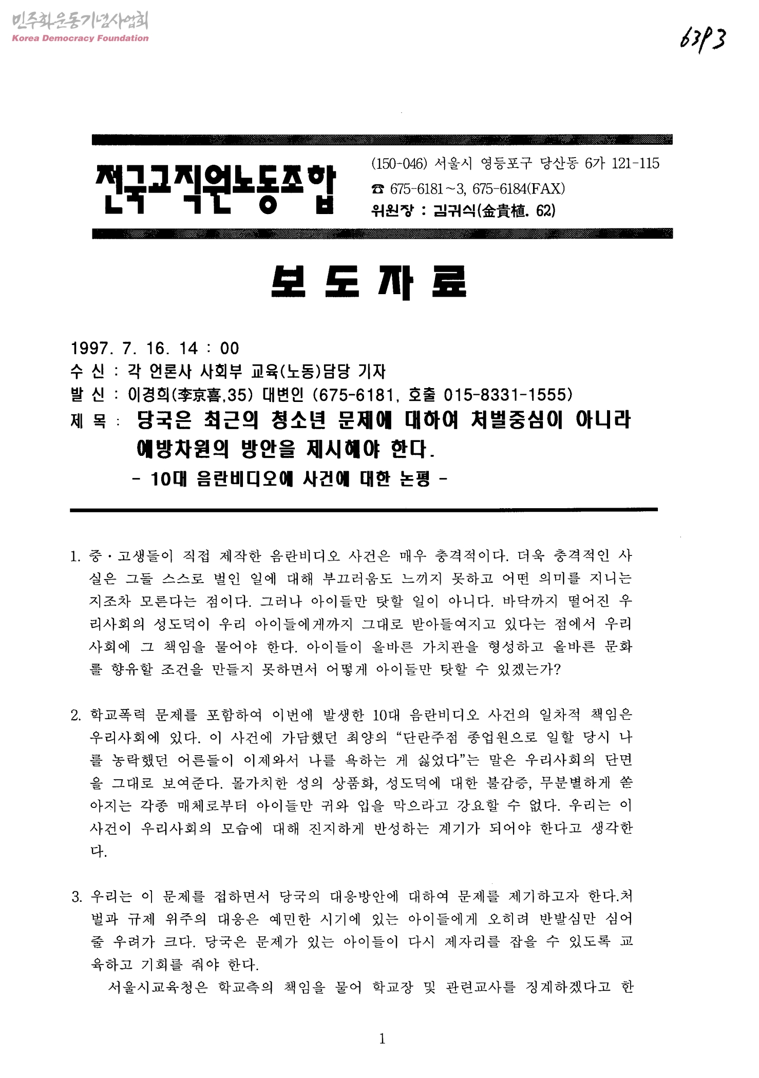 보도자료-당국은 최근의 청소년 문제에 대하여 처벌중심이 아니라 예방차원의 방안을 제시해야 한다(10대 음란비디오 사건에 대한 논평)[수신:각 언론사 사회부 교육(노동)담당 기자, 발신:이경희 대변인]