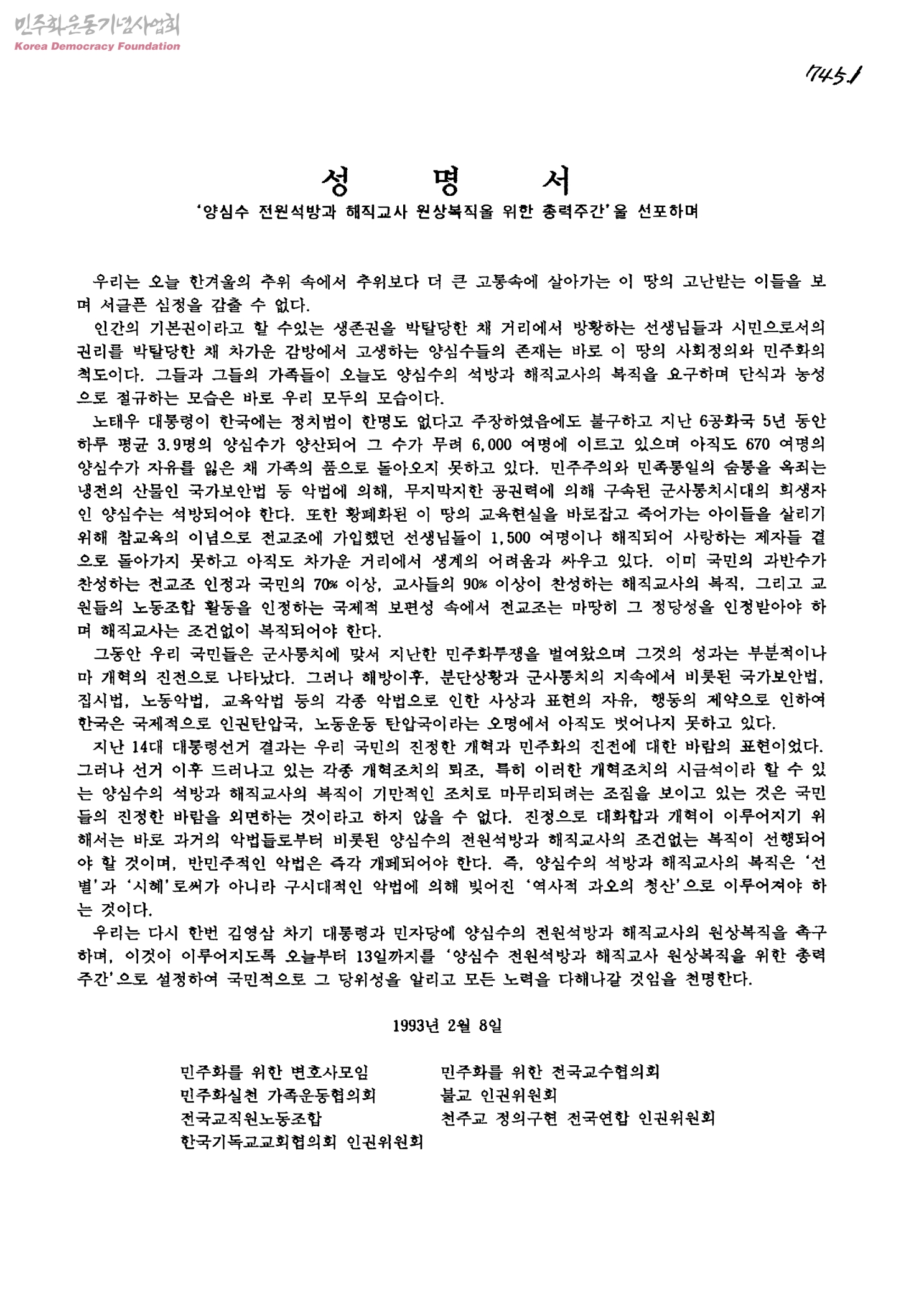 성명서 양심수 전원석방과 해직교사 원상복직을 위한 총력주간을 선포하며