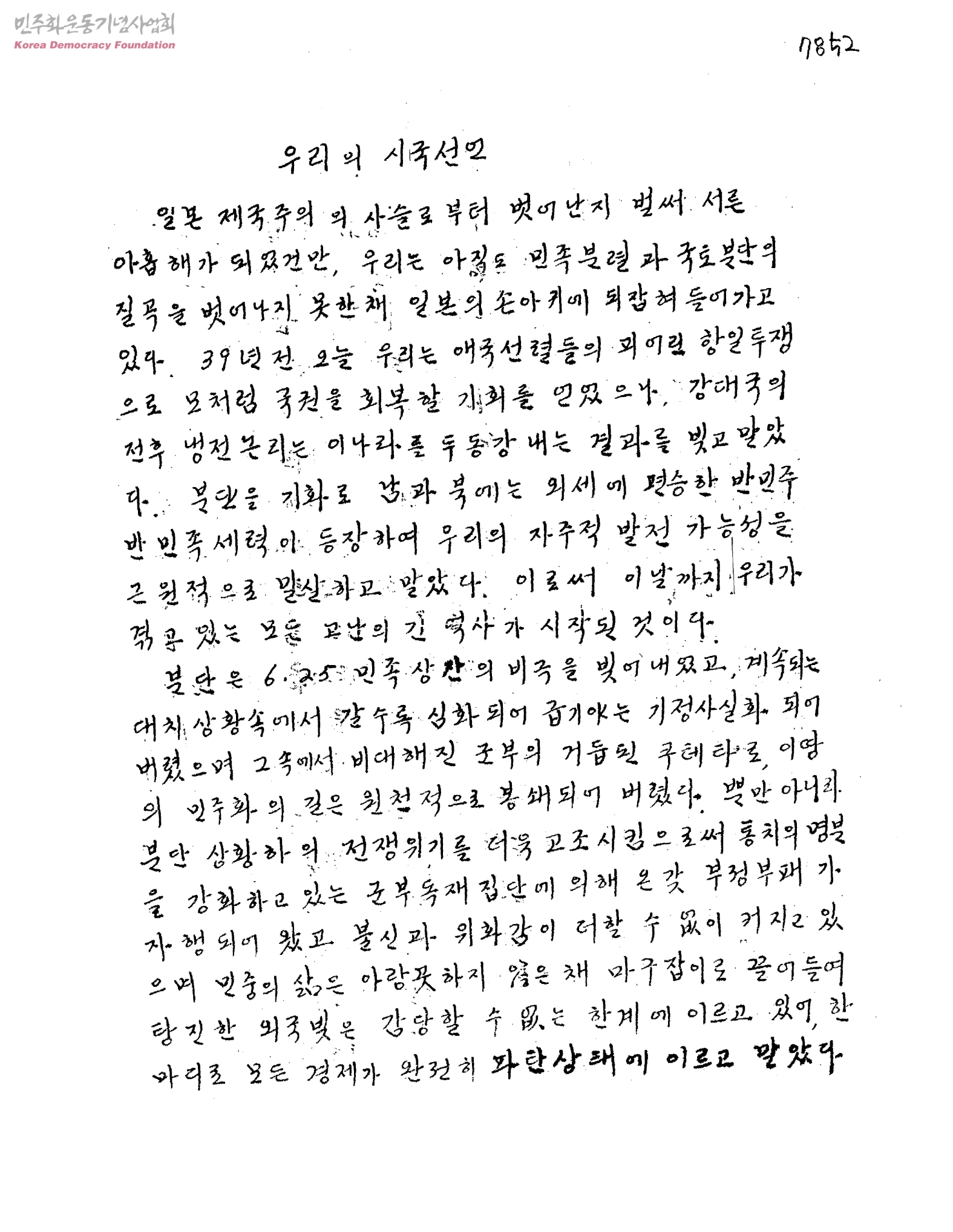 우리의 시국선언[8.15 39돐을 맞이하여 자유민주정치 회복 등을 요구하는 성명서]
