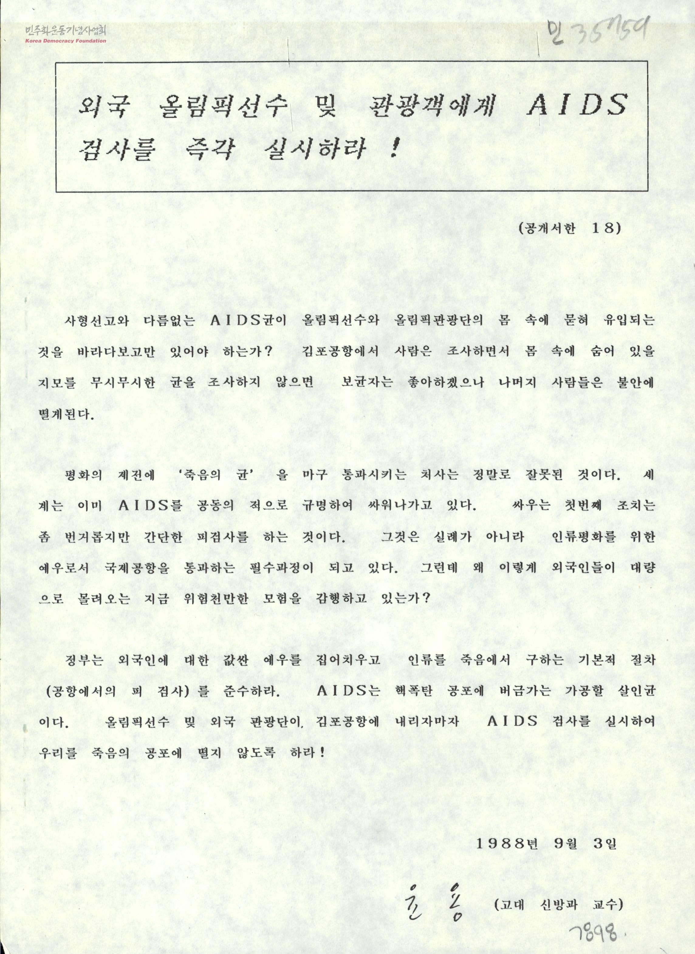 외국 올림픽선수 및 관광객에게 AIDS 검사를 즉각 실시하라!