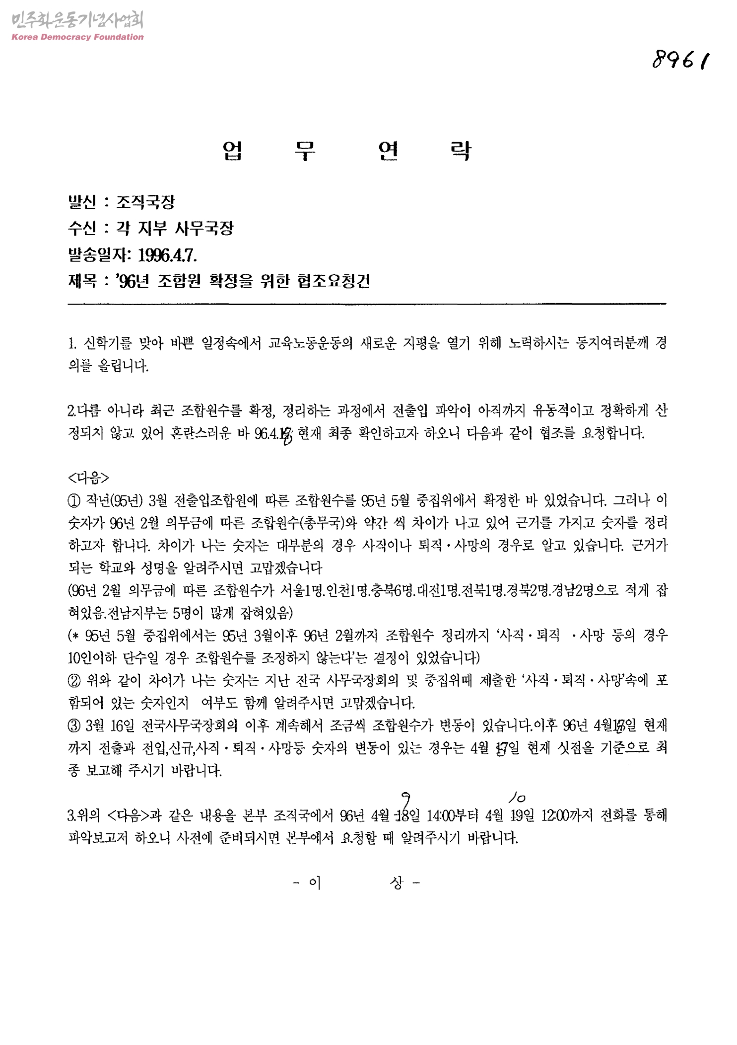 96년 조합원 확정을 위한 협조요청건[수신:각 지부 사무국장, 발신:조직국장]