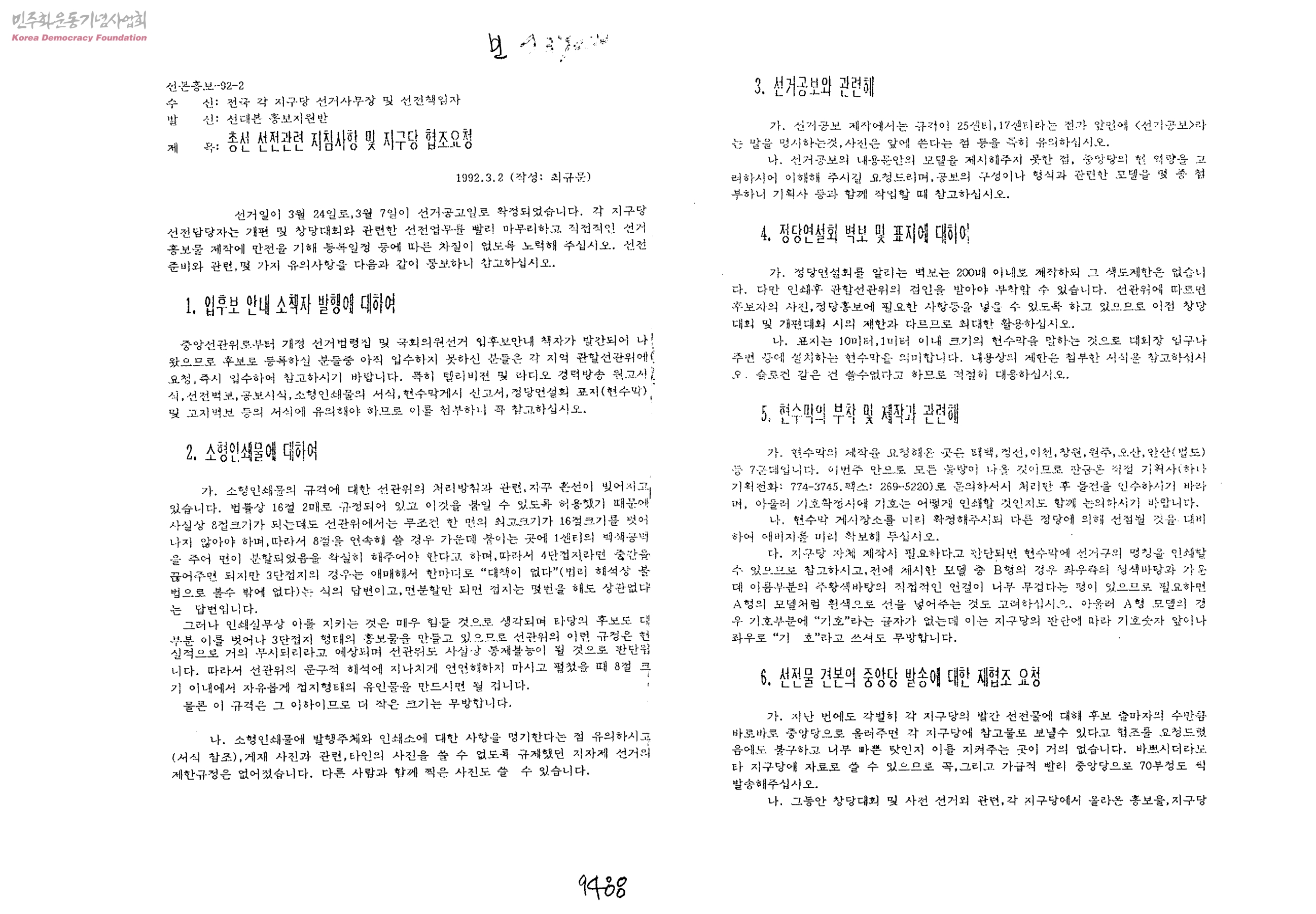 총선 선전관련 지침사항 및 지구당 협조요청[수신:전국 각 지구당 선거사무장 및 선전책임자]