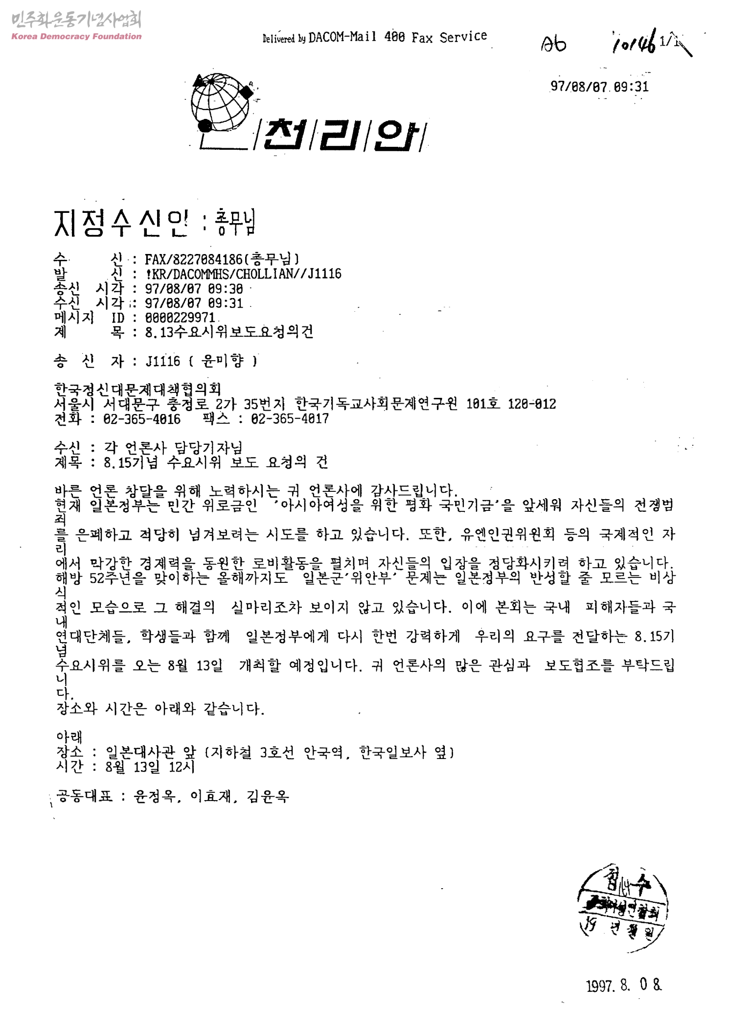 8.15기념 수요시위 보도 요청의 건[수신:각 언론사 담당기자, 발신:한국정신대문제대책협의회]