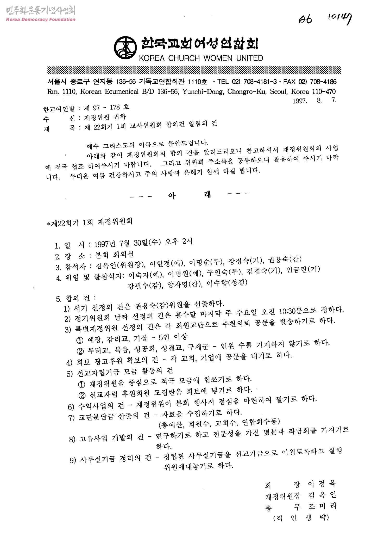제22회기 1회 교사위원회 합의건 알림의 건[수신:재정위원, 발신:한국교회여성연합회]
