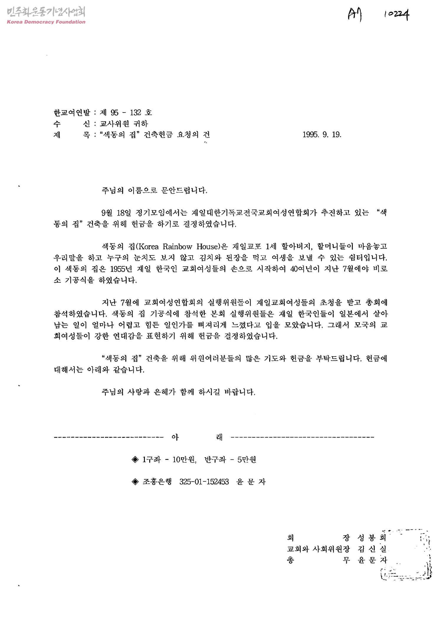 색동의 집 건축헌금 요청의 건[수신:교사위원, 발신:한국교회여성연합회]