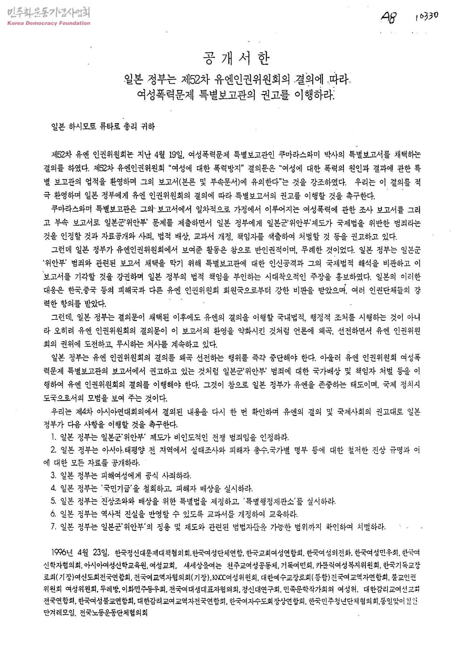 일본 정부는 제52차 유엔인권위원회의 결의에 따라 여성폭력무제 특별보고관의 권고를 이행하라