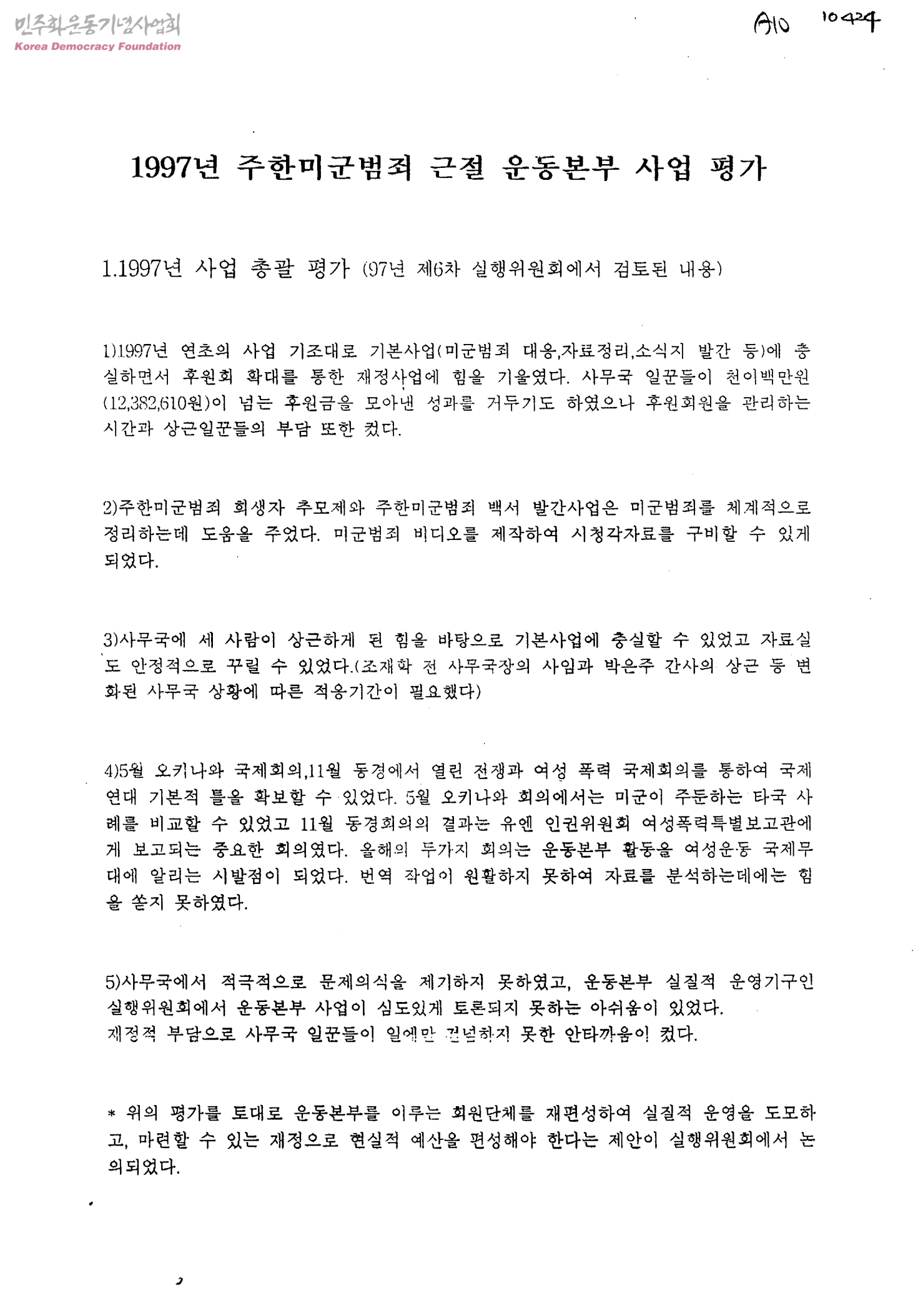 1997년 주한미군범죄 근절 운동본부 사업 평가