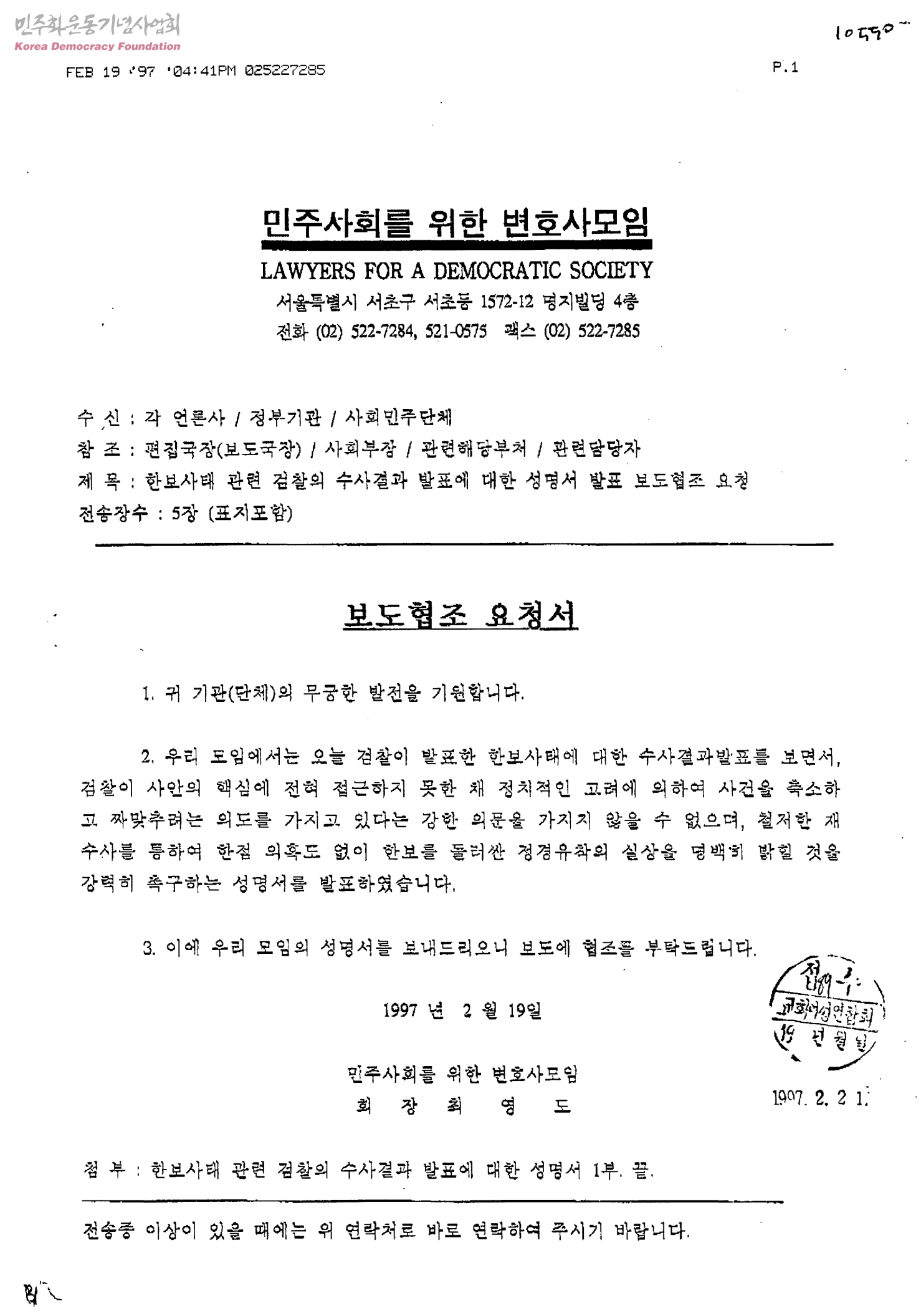 [한보사태 관련 보도협조 요청1][수신:각 언론사, 정부기관, 사회민주단체, 발신:민주사회를 위한 변호사모임]