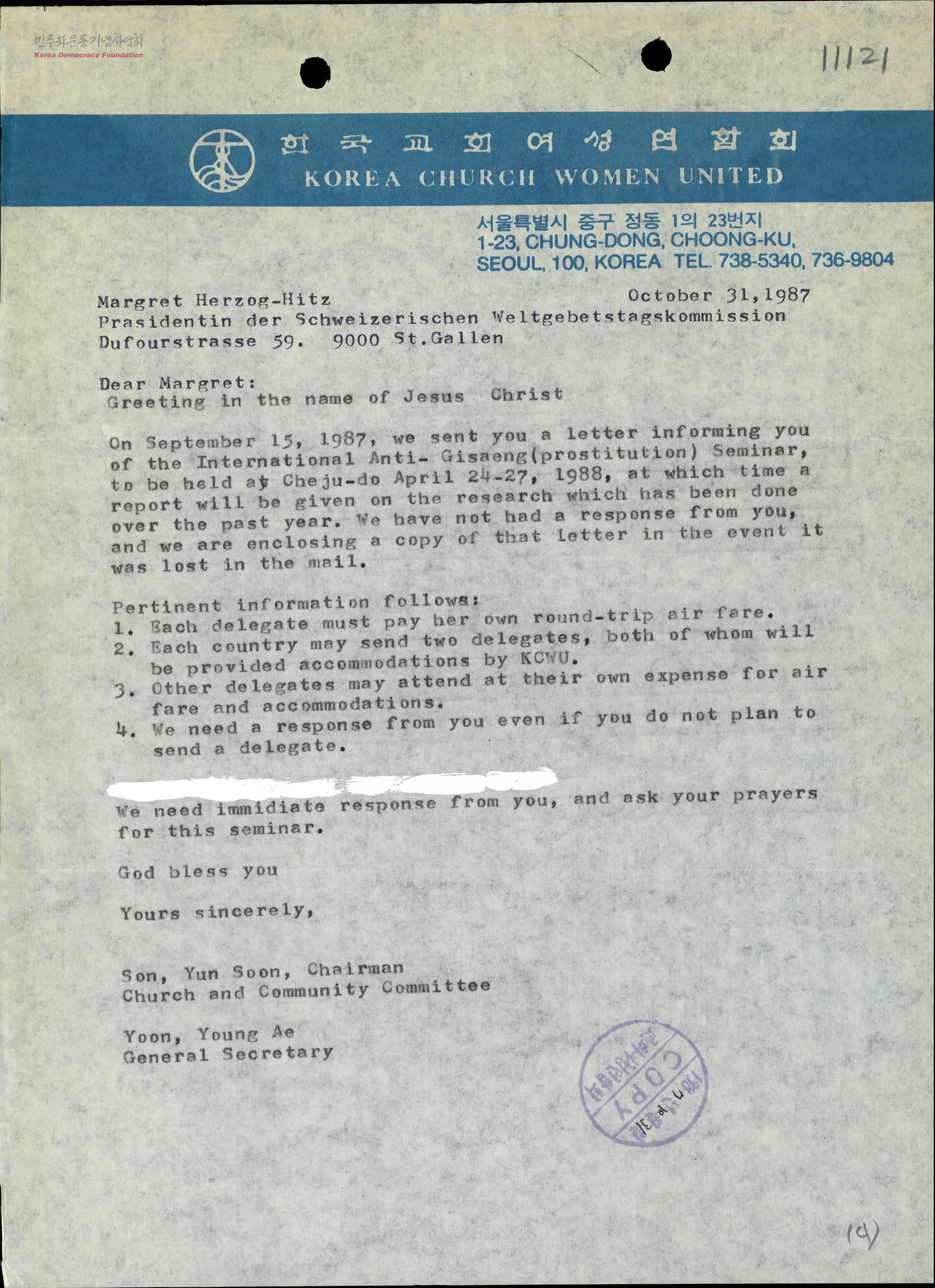 [반기생관광국세미나 초청에 대한 회신촉구(Margret Herzog-Hitz, Prasidentin der Schweizerischen Weltgebetstagskommission)]