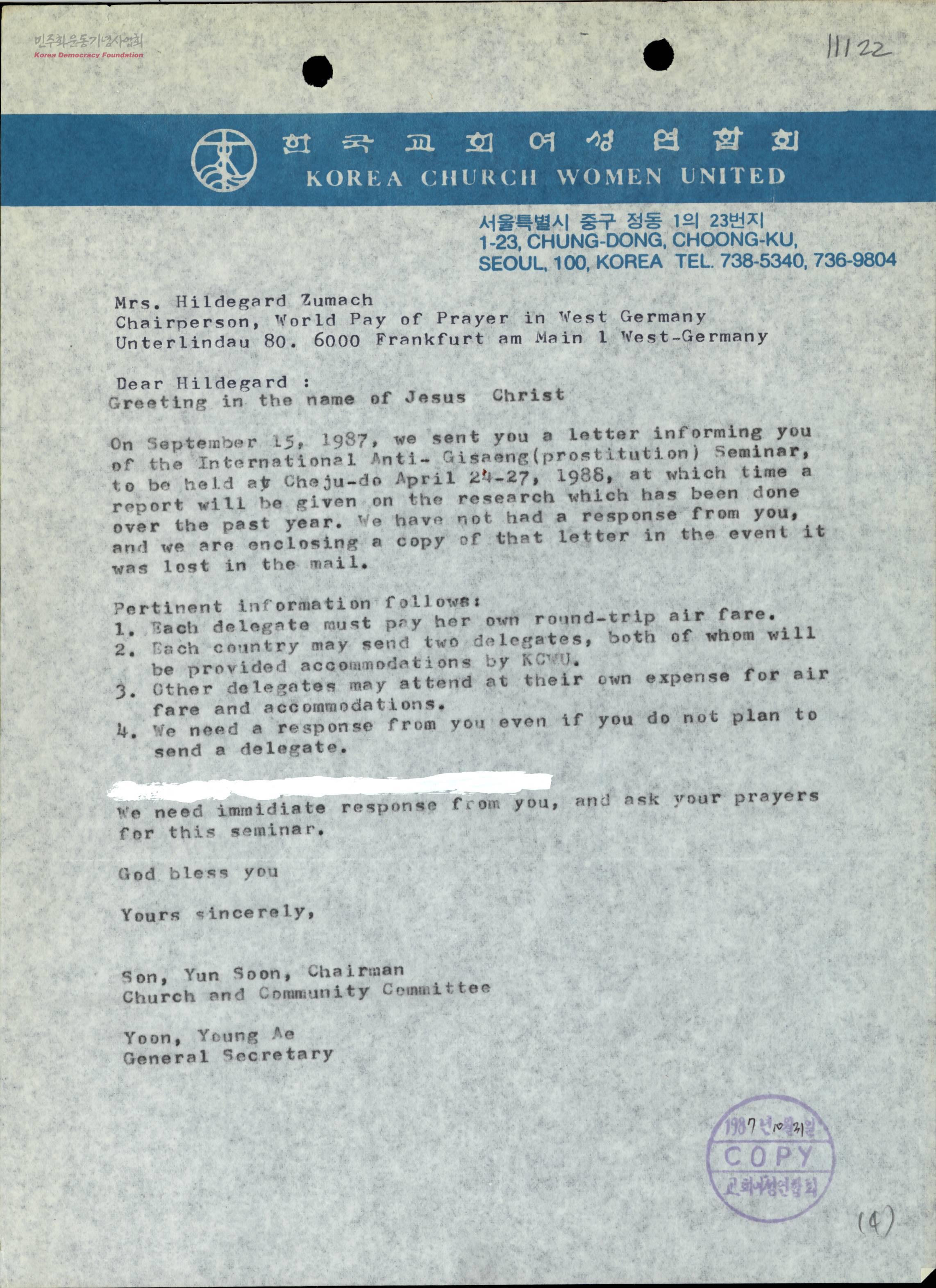 [반기생관광국세미나 초청에 대한 회신촉구(Mrs. Hildegard Zumach, West-Germany)]