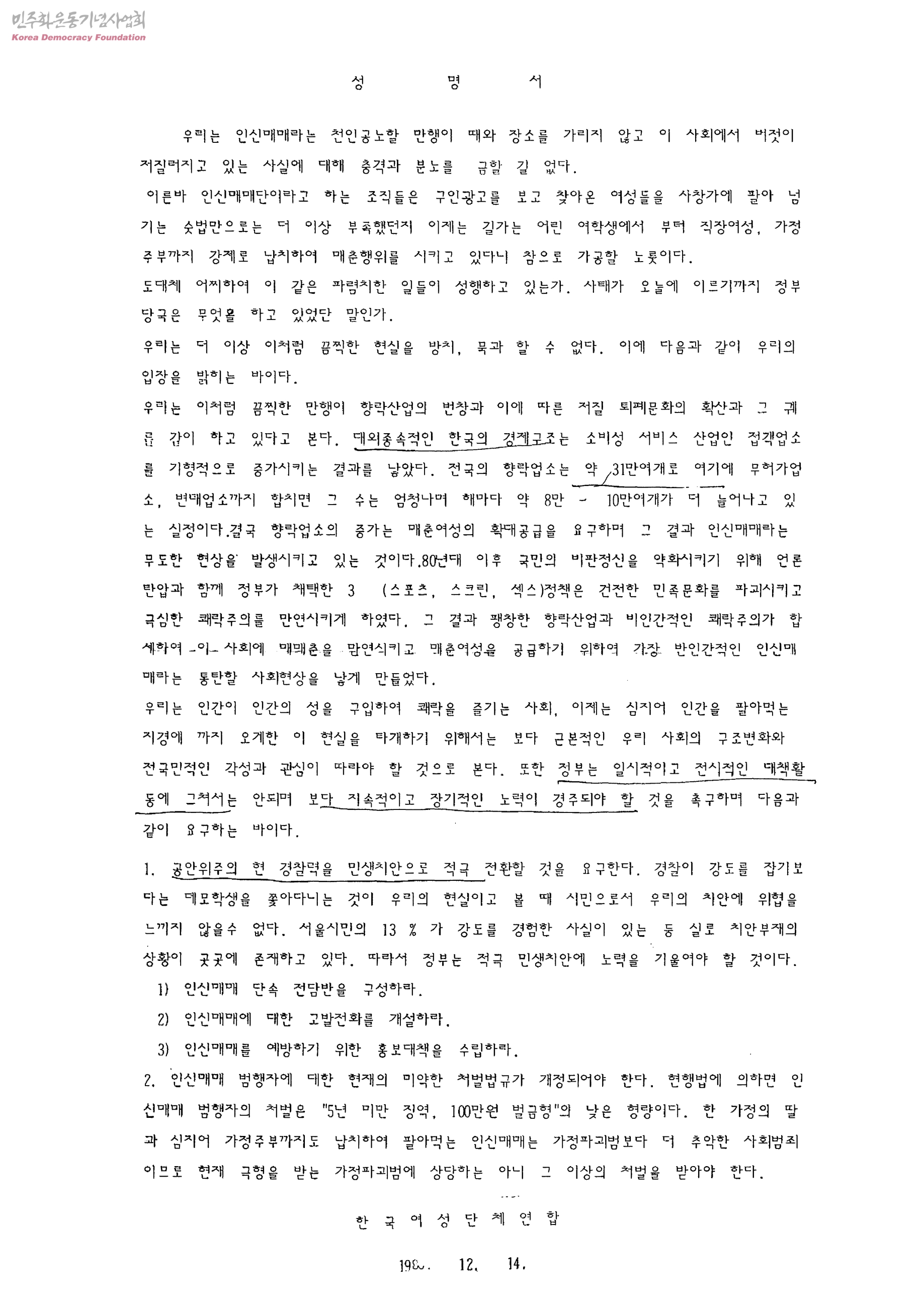 성명서[인신매매,향락업소증가등 민생치안에 공권력 적극대처 요구관련]