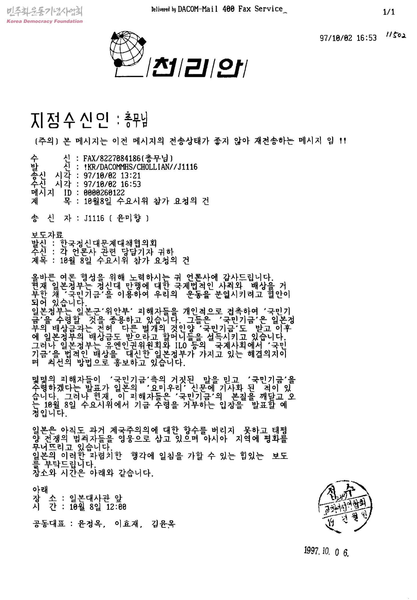 10월8일 수요시위 참가 요청의 건[수신:각 언론사 관련 담당기자, 발신:한국정신대문제대책협의회]