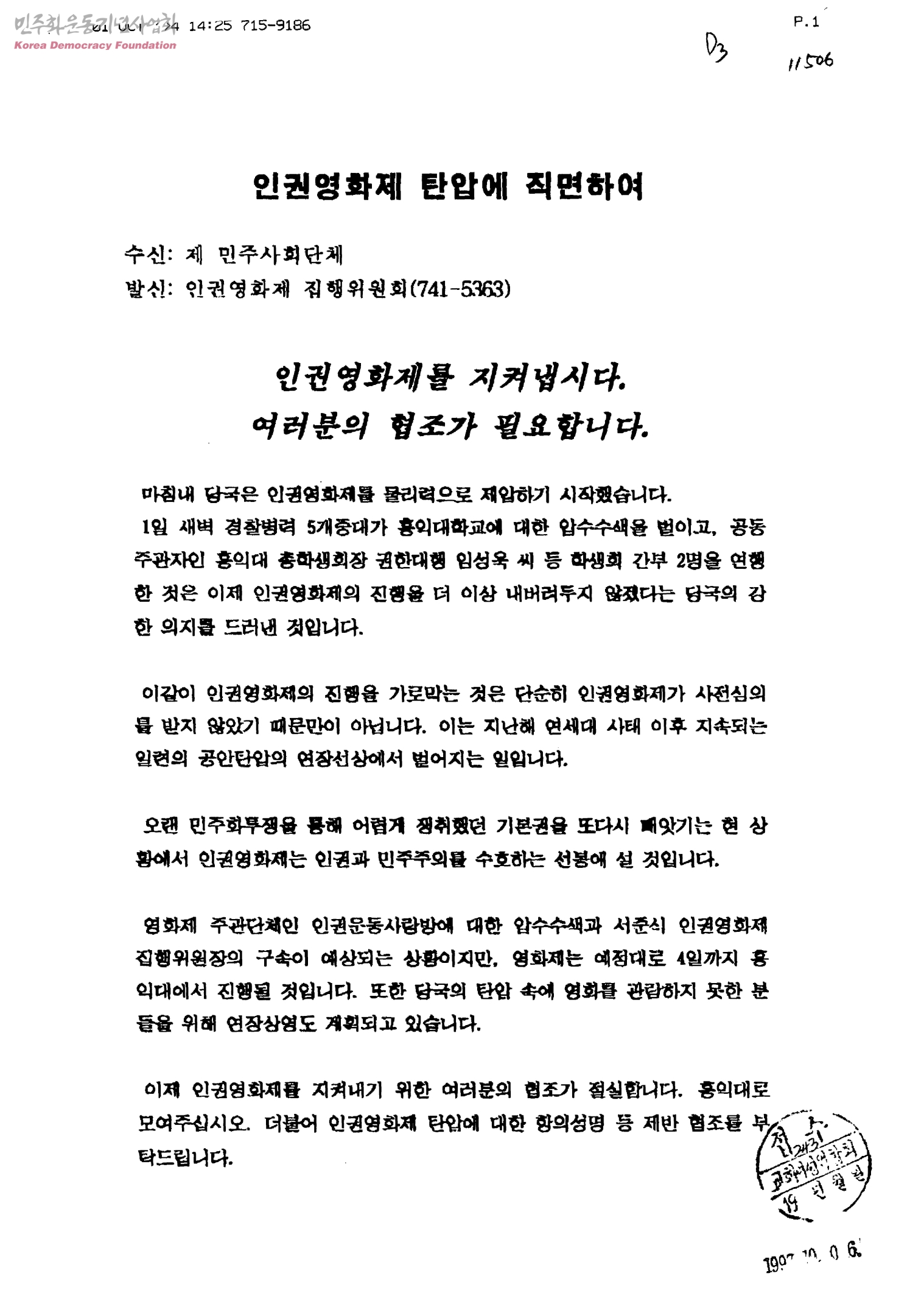 인권영화제 탄압에 직면하여[수신:제 민주사회단체, 발신:인권영화제 집행위원회]