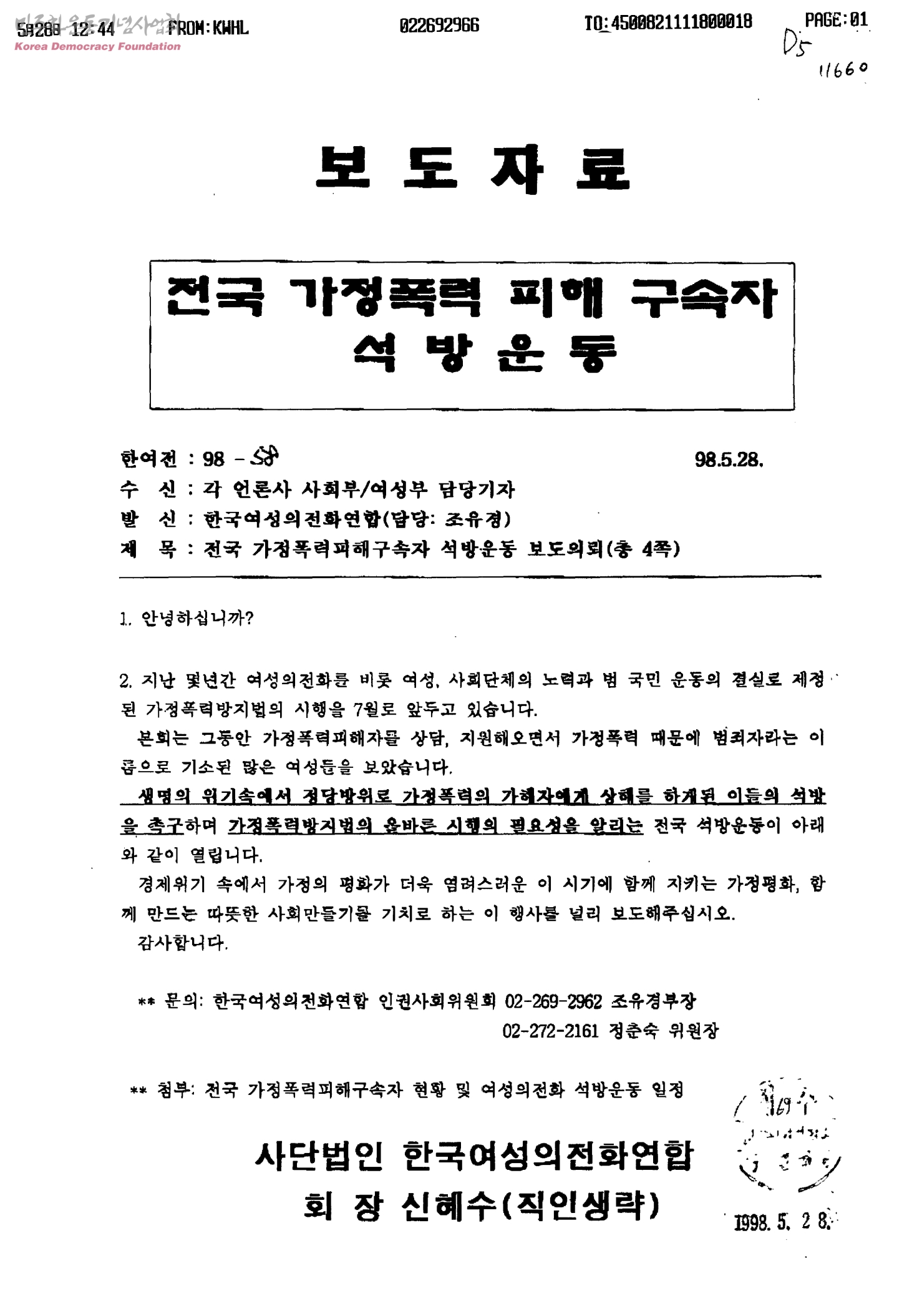 전국 가정폭력피해구속자 석방운동 보도의뢰[수신:각 언론사 사회부/여성부 담당기자, 발신:한국여성의전화연합]