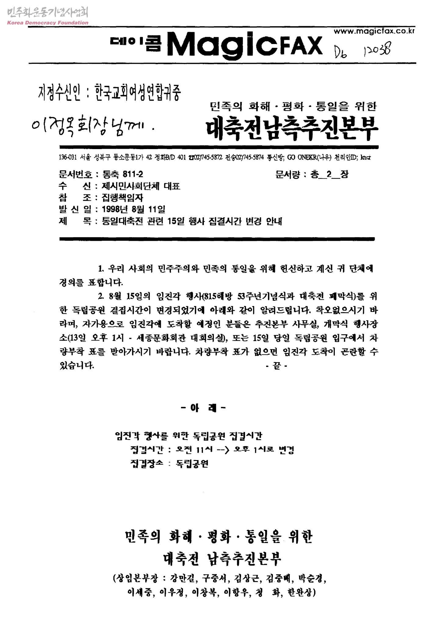 통일대축전 관련 15일 행사 집결시간 변경 안내[수신:제시민사회단체 대표, 발신:민족의화해평화통일을위한대축전남측추진본부]