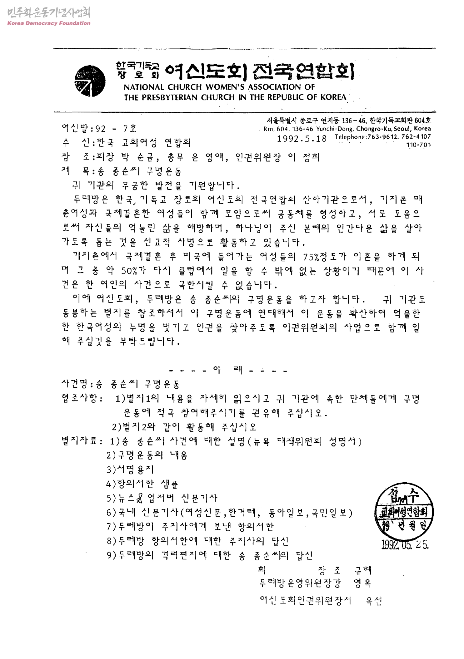 송종순씨 구명운동[수신:한국교회여성연합회, 발신:한국기독교장로회 여신도회전국연합회]