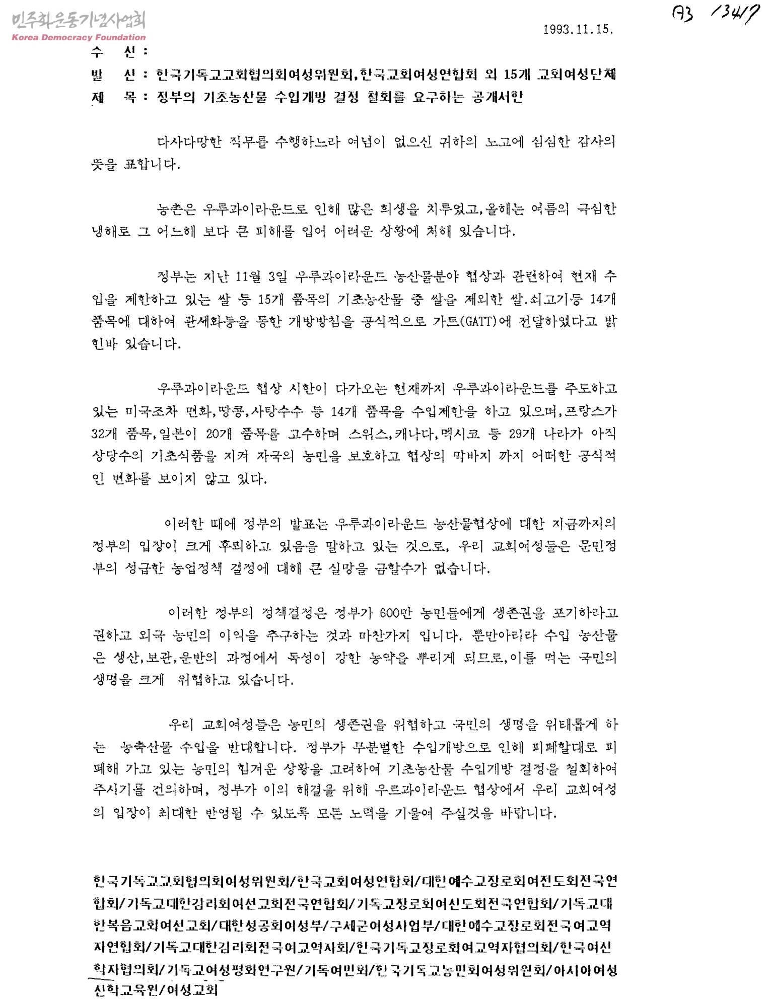 정부의 기초농산물 수입개방 결정 철회를 요구하는 공개서한
