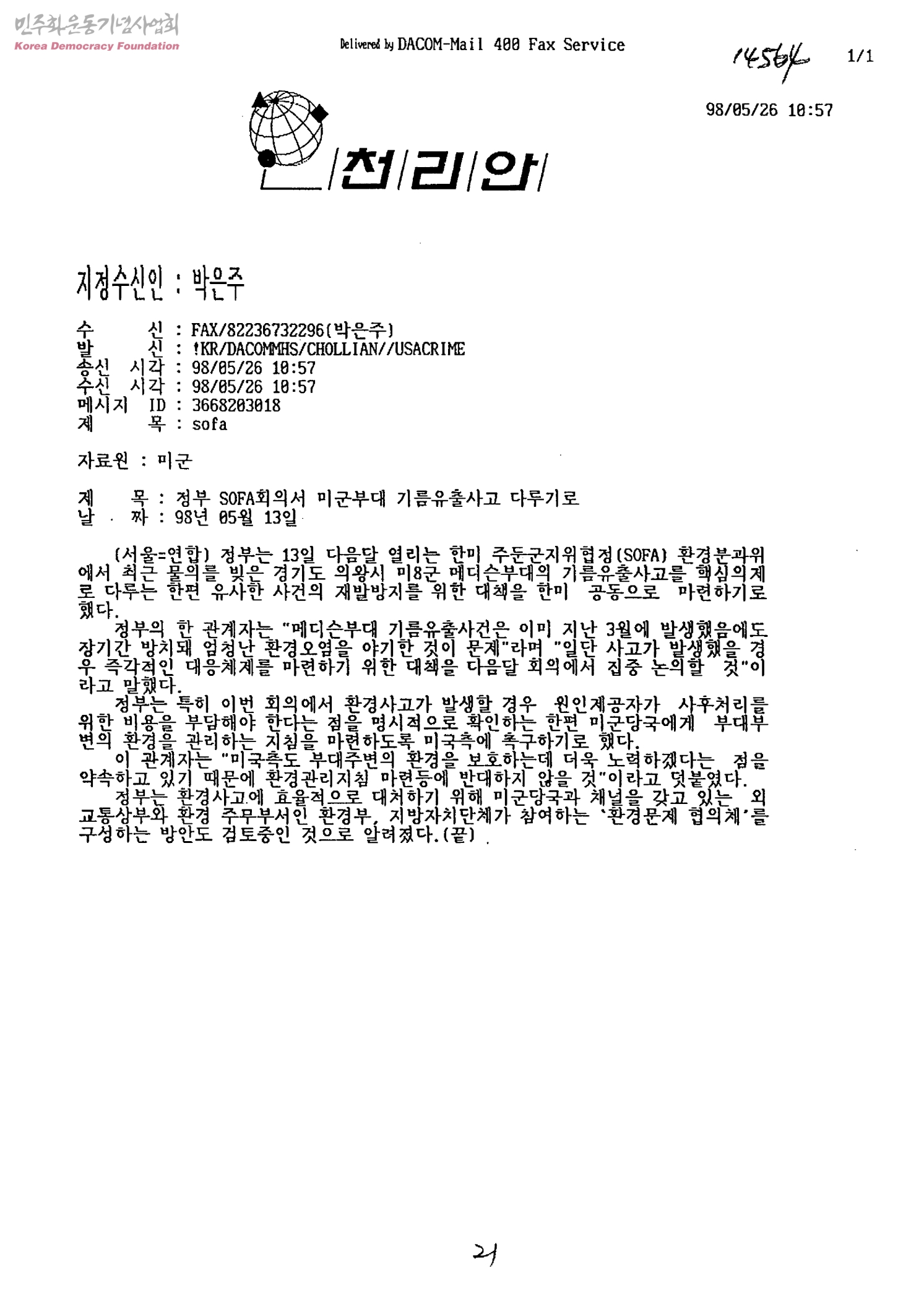 정부 SOFA회의서 미군부대 기름유출사고 다루기로[수신:박은주, 발신:주한미군범죄근절운동본부]