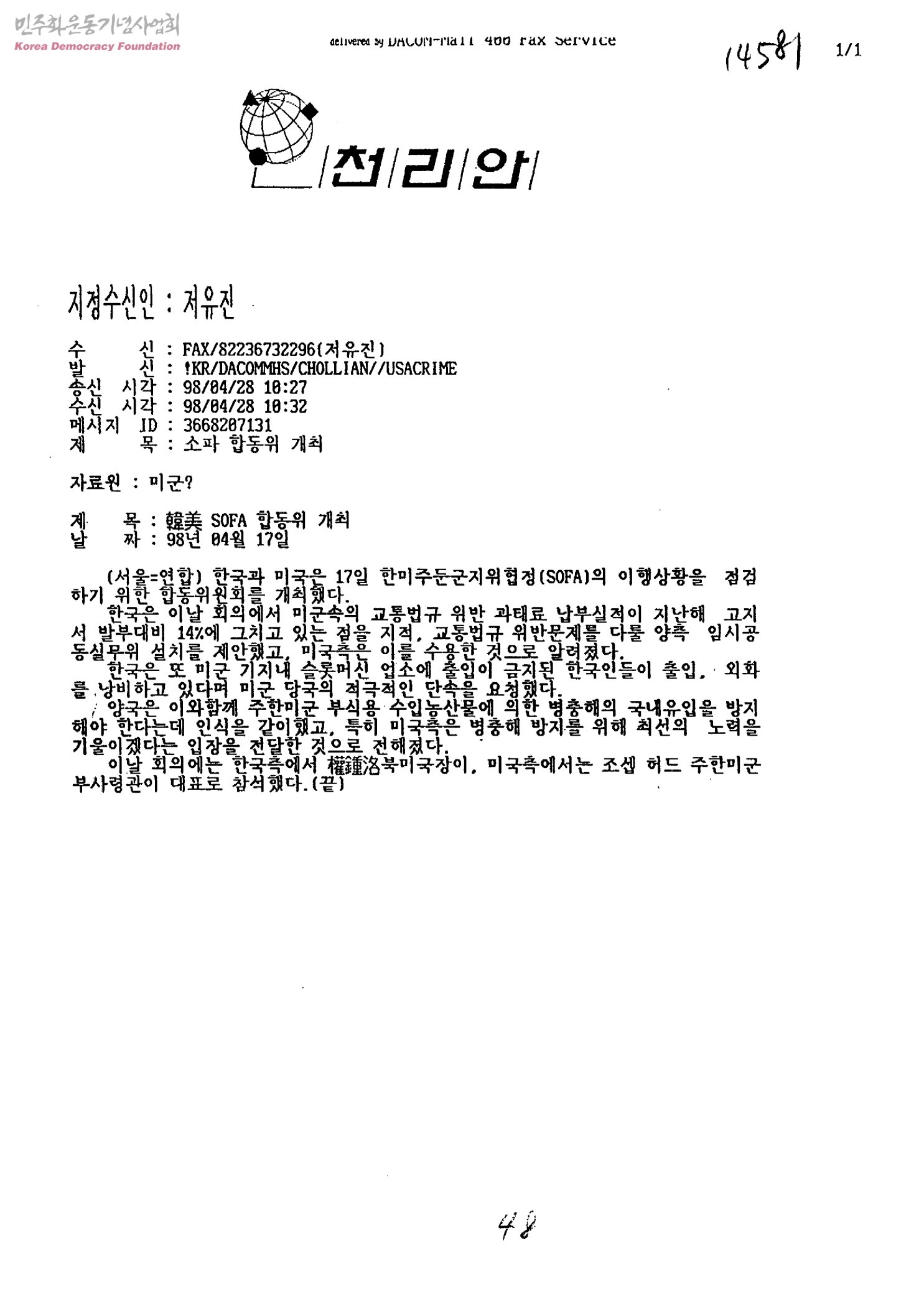 韓美 SOFA 합동위 개최[수신:정유진, 발신:주한미군범죄근절운동본부]