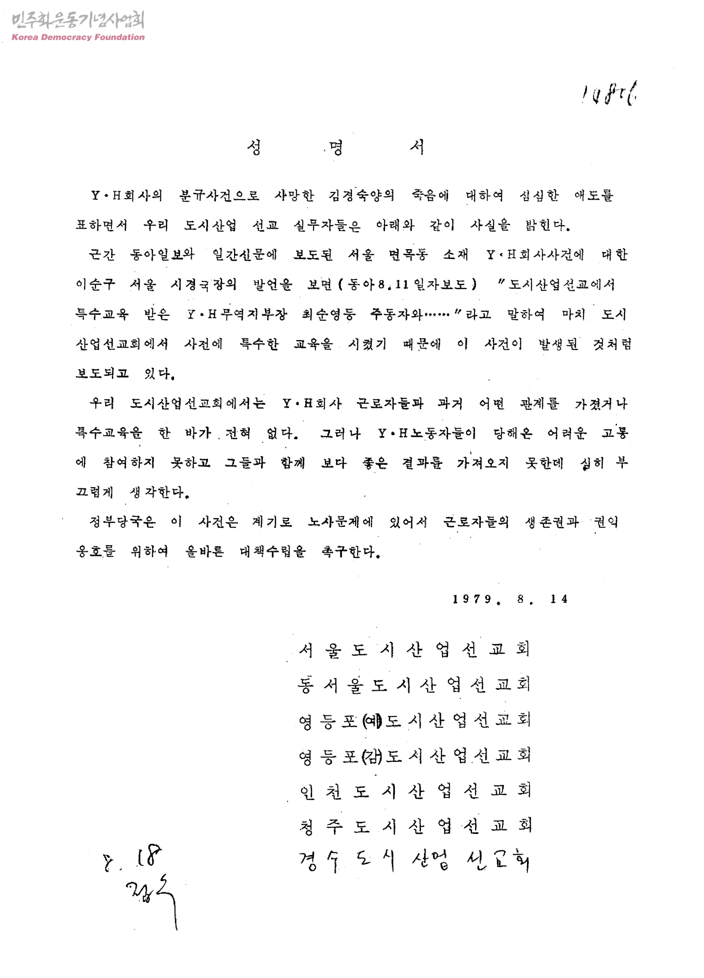 성명서[Y.H근로자들의 생존권과 권익 옹호에 관한]