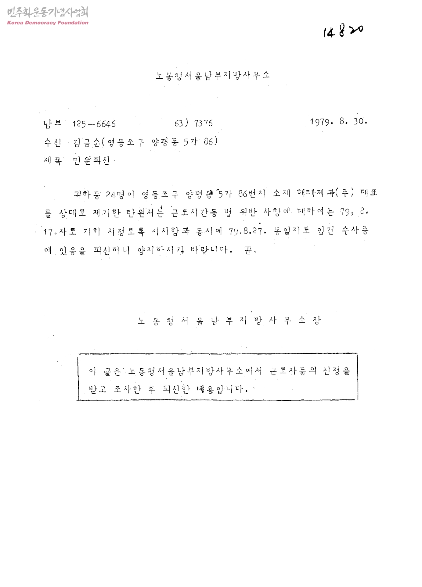 민원회신[수신:김금순, 발신:노동청서울남부지방사무소장]