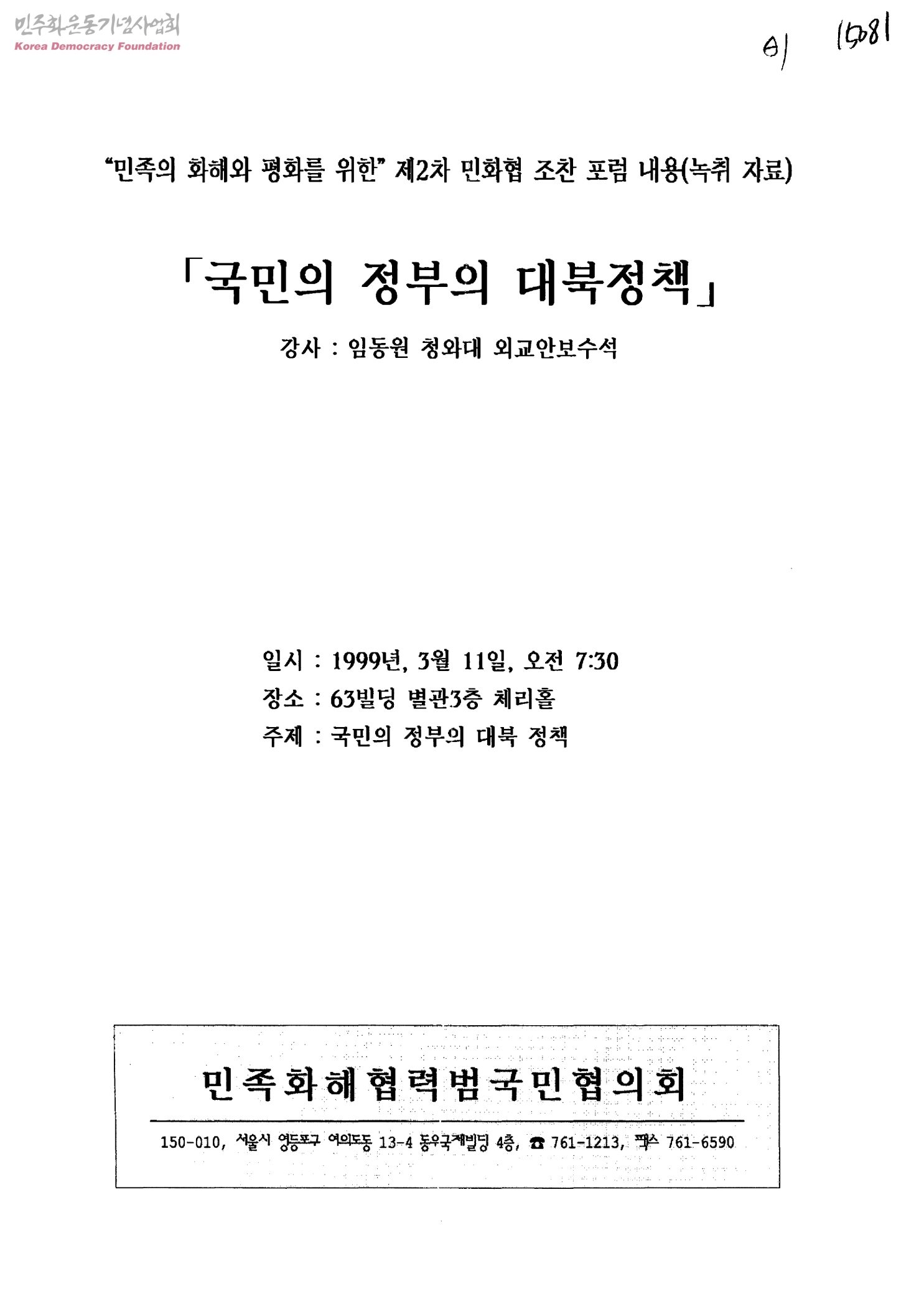 국민의 정부의 대북정책-민족의 화해와 평화를 위한 제2차 민화협 조찬 포럼 내용(녹취 자료)