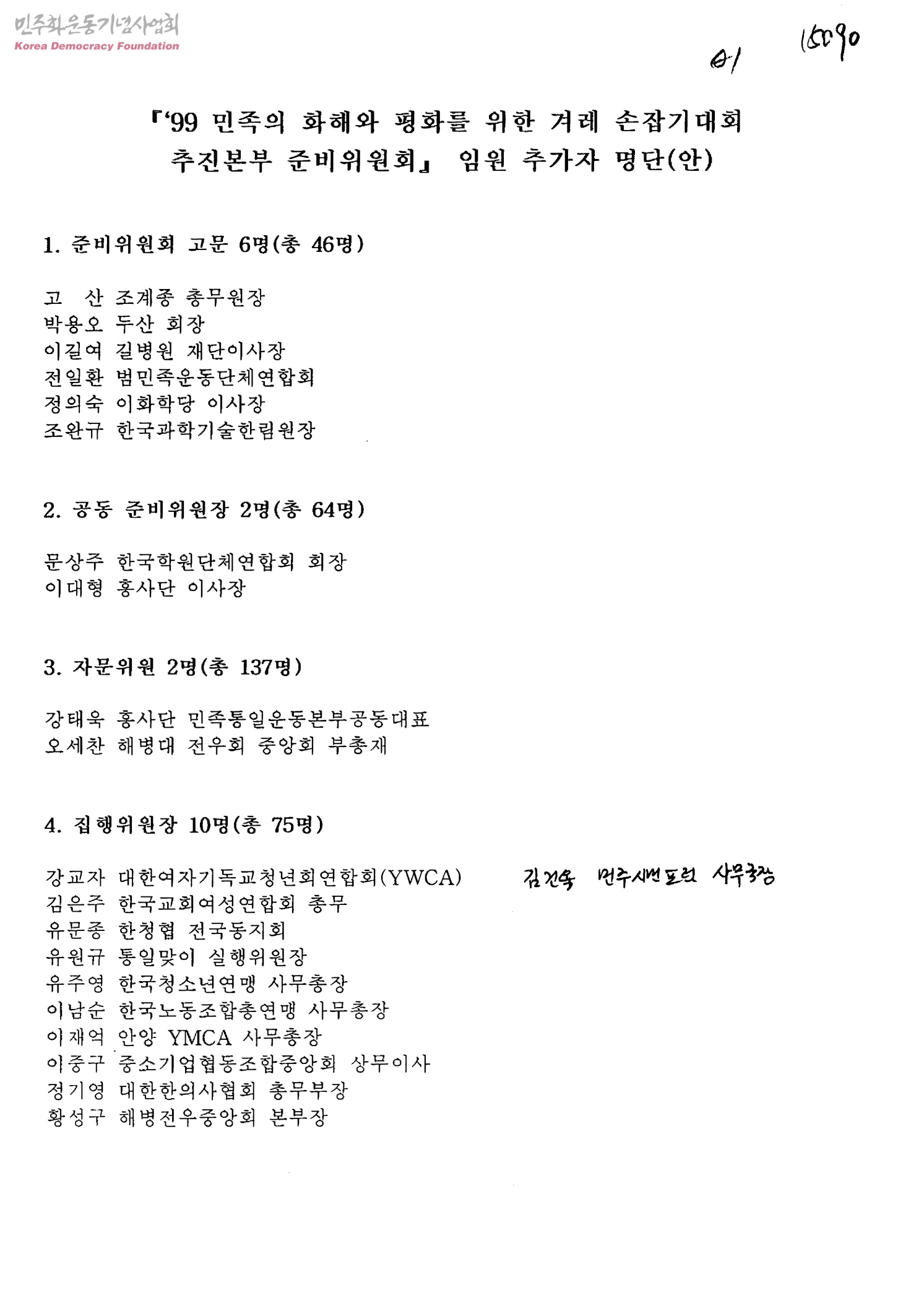 99 민족의 화해와 평화를 위한 겨레 손잡기대회추진본부 준비위원회 임원 추가자 명단(안)