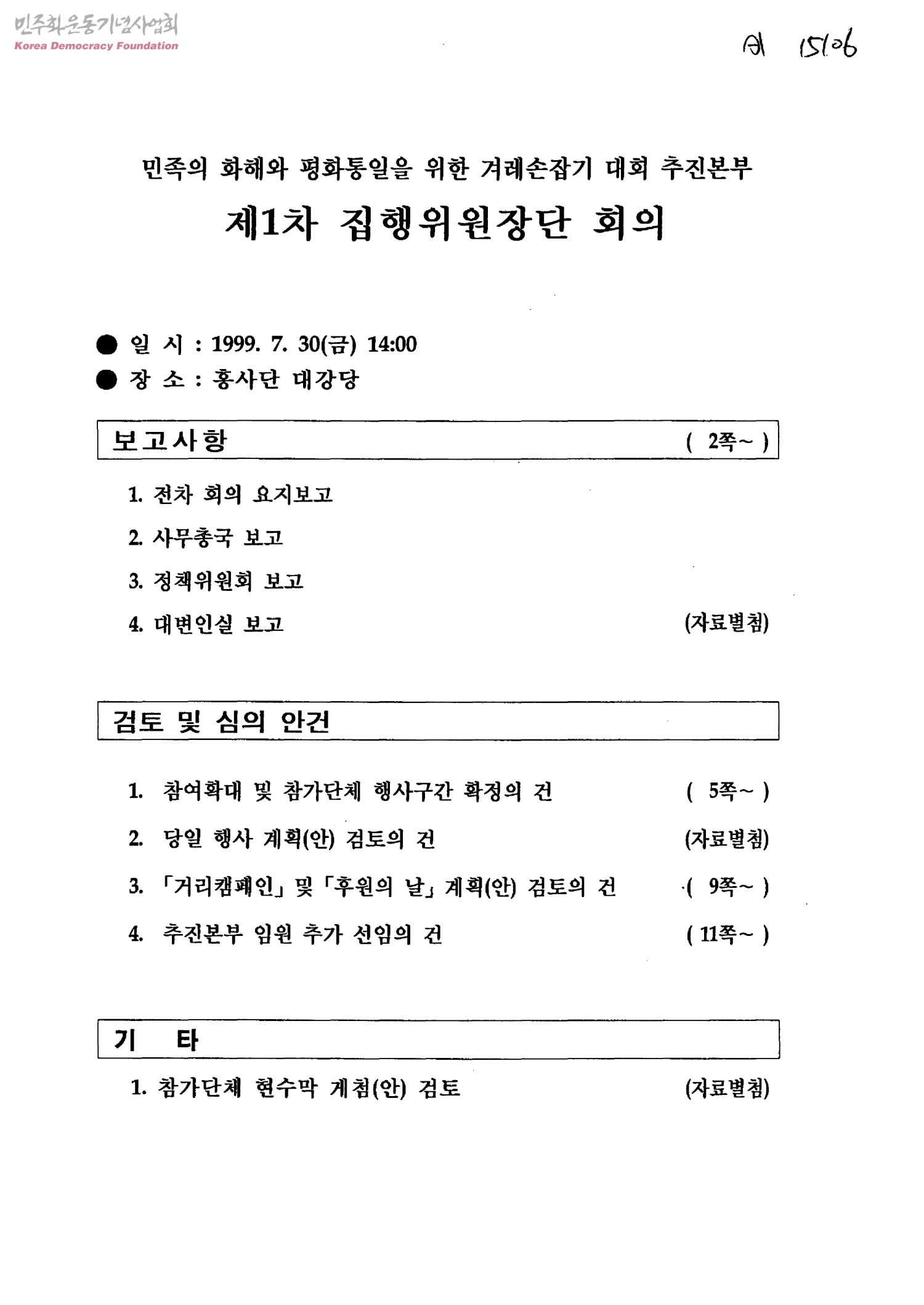 민족의 화해와 평화통일을 위한 겨레손잡기 대회 추진본부-제1차 집행위원장단 회의
