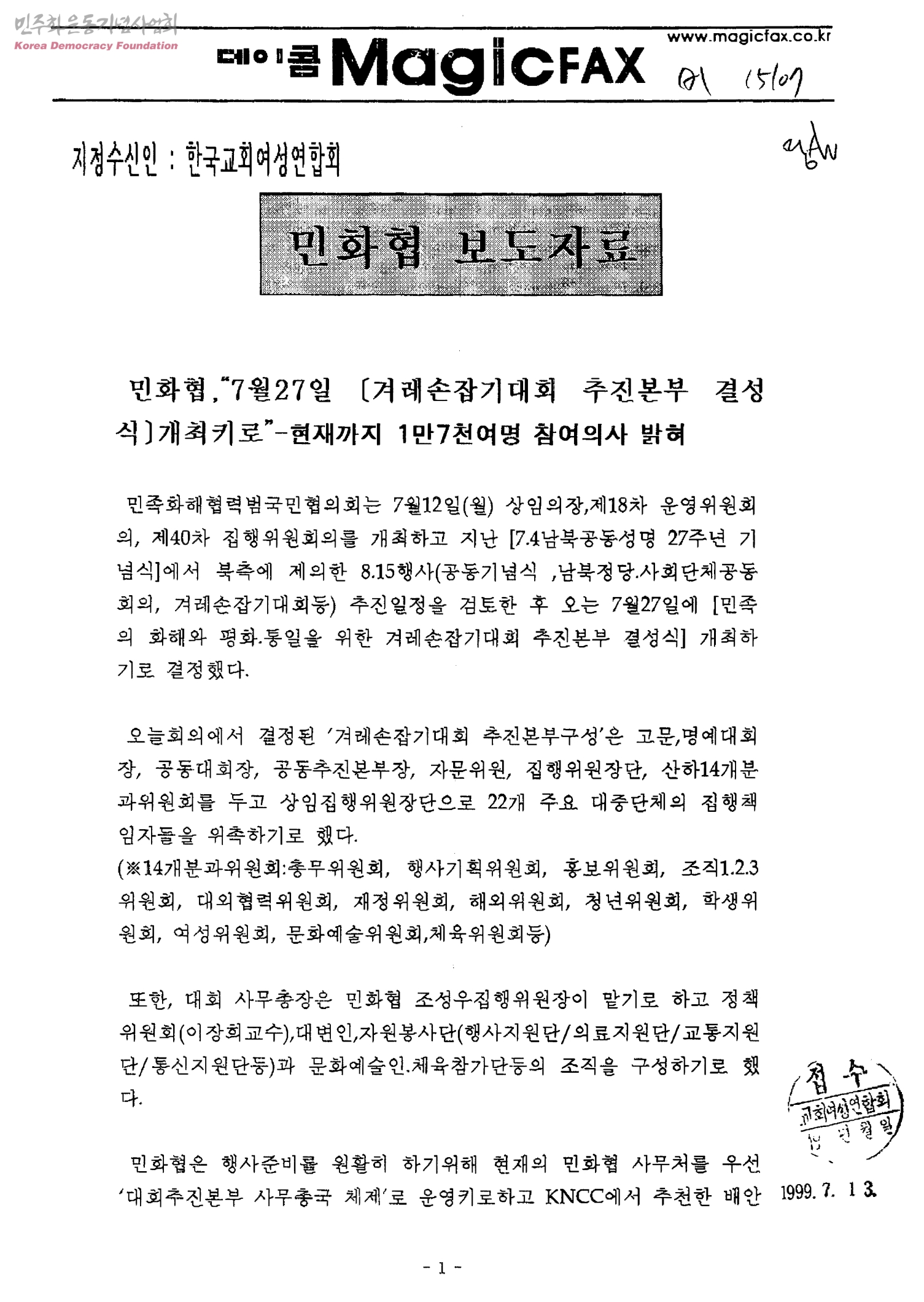 민화협, 7월 27일 겨레손잡기대회 추진본부 결성식 개최키로[수신:한국교회여성연합회, 발신:민족화해협력범국민협의회 대변인실]