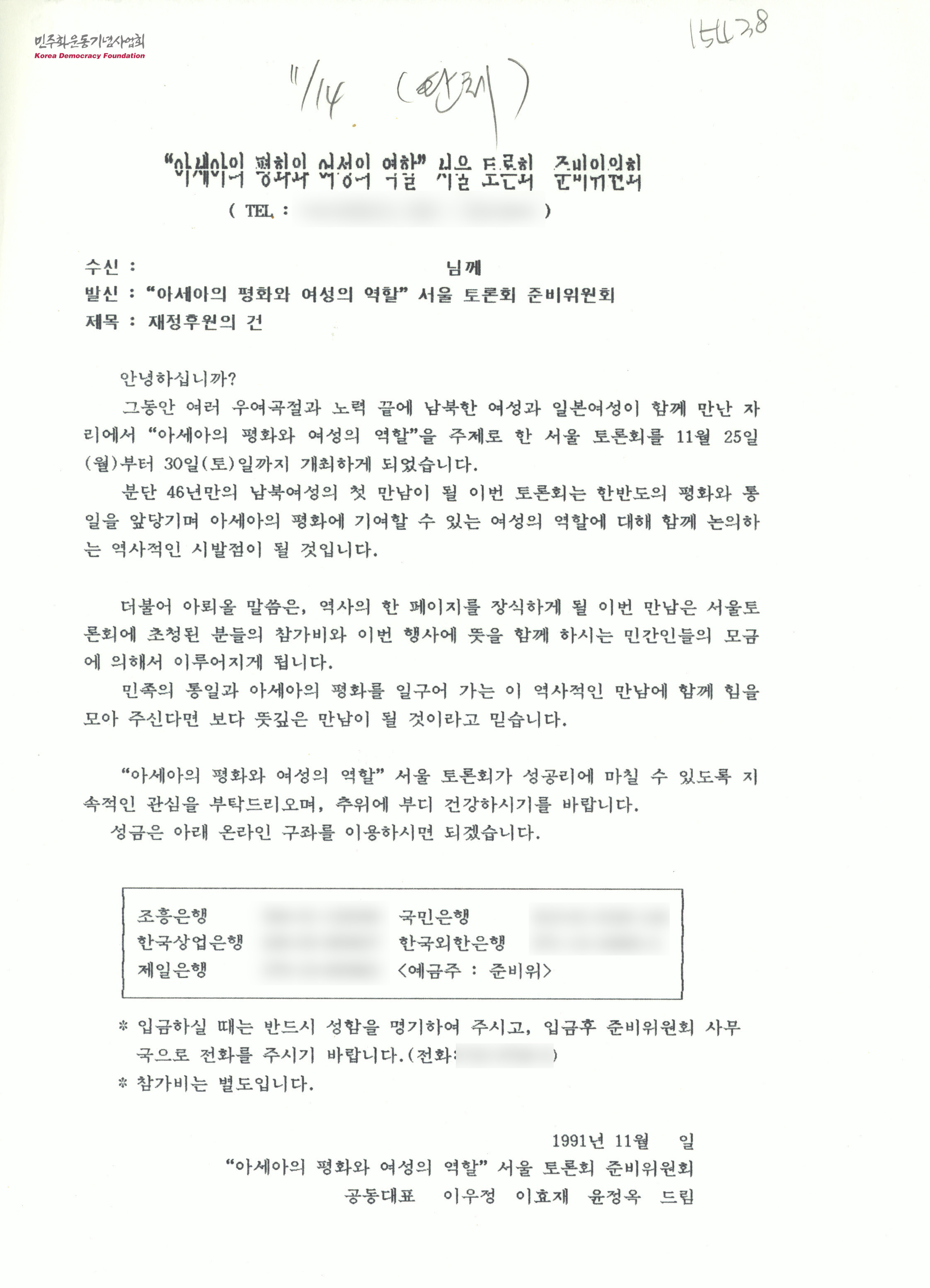 - "아세아의 평화와 여성의 역할" 서울 토론회 준비위원회 공동대표 이우정, 이효재, 윤정옥 드림