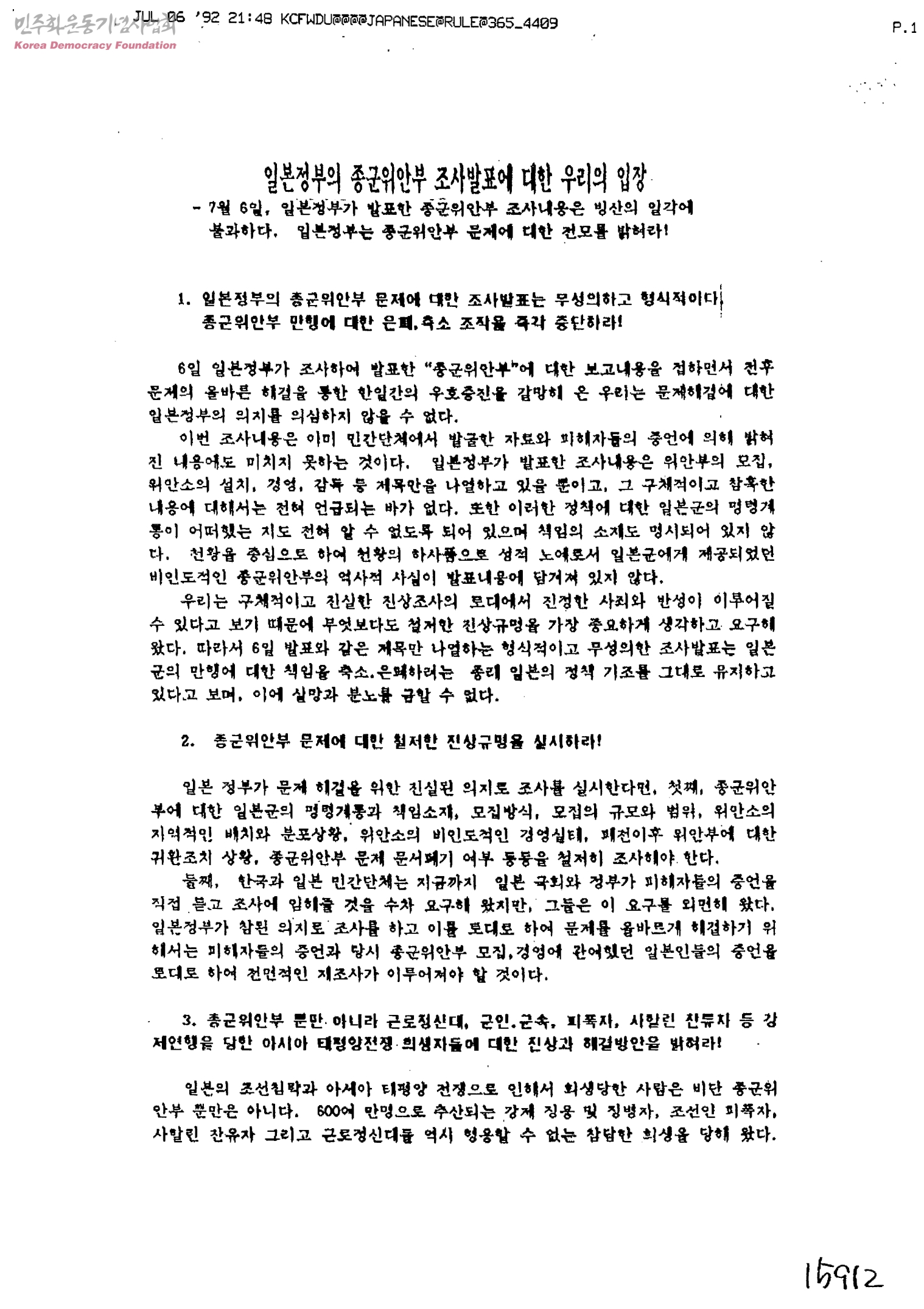 일본정부의 종군위안부 조사발표에 대한 우리의 입장