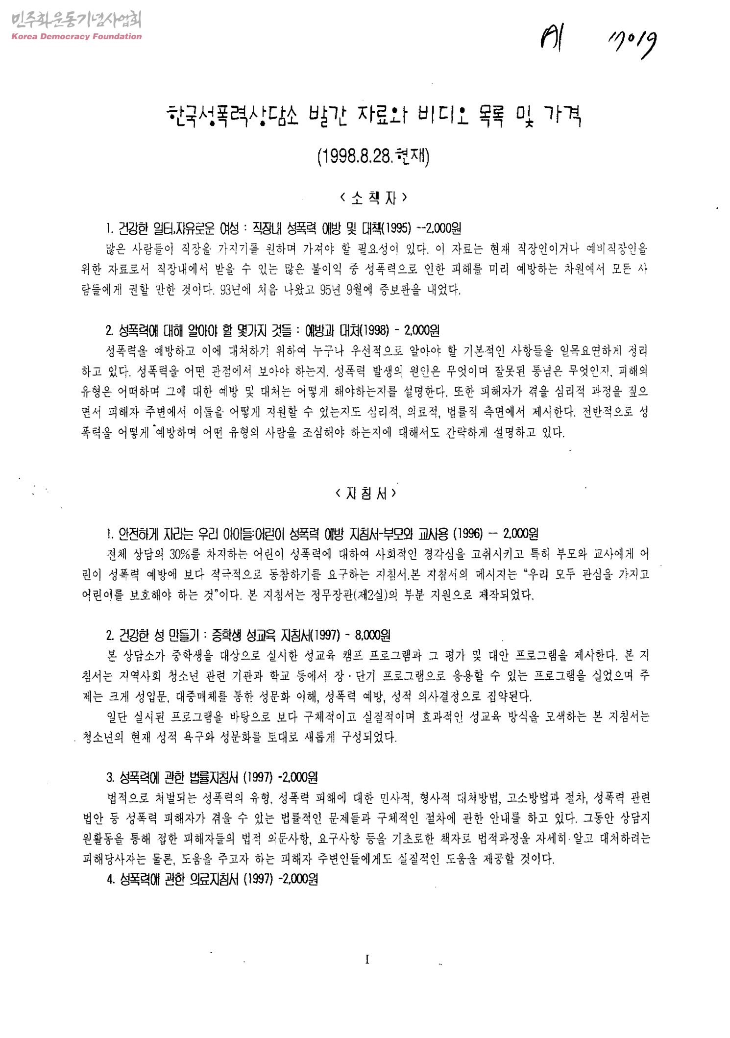 한국성폭력상담소 발간 자료와 비디오 목록 및 가격