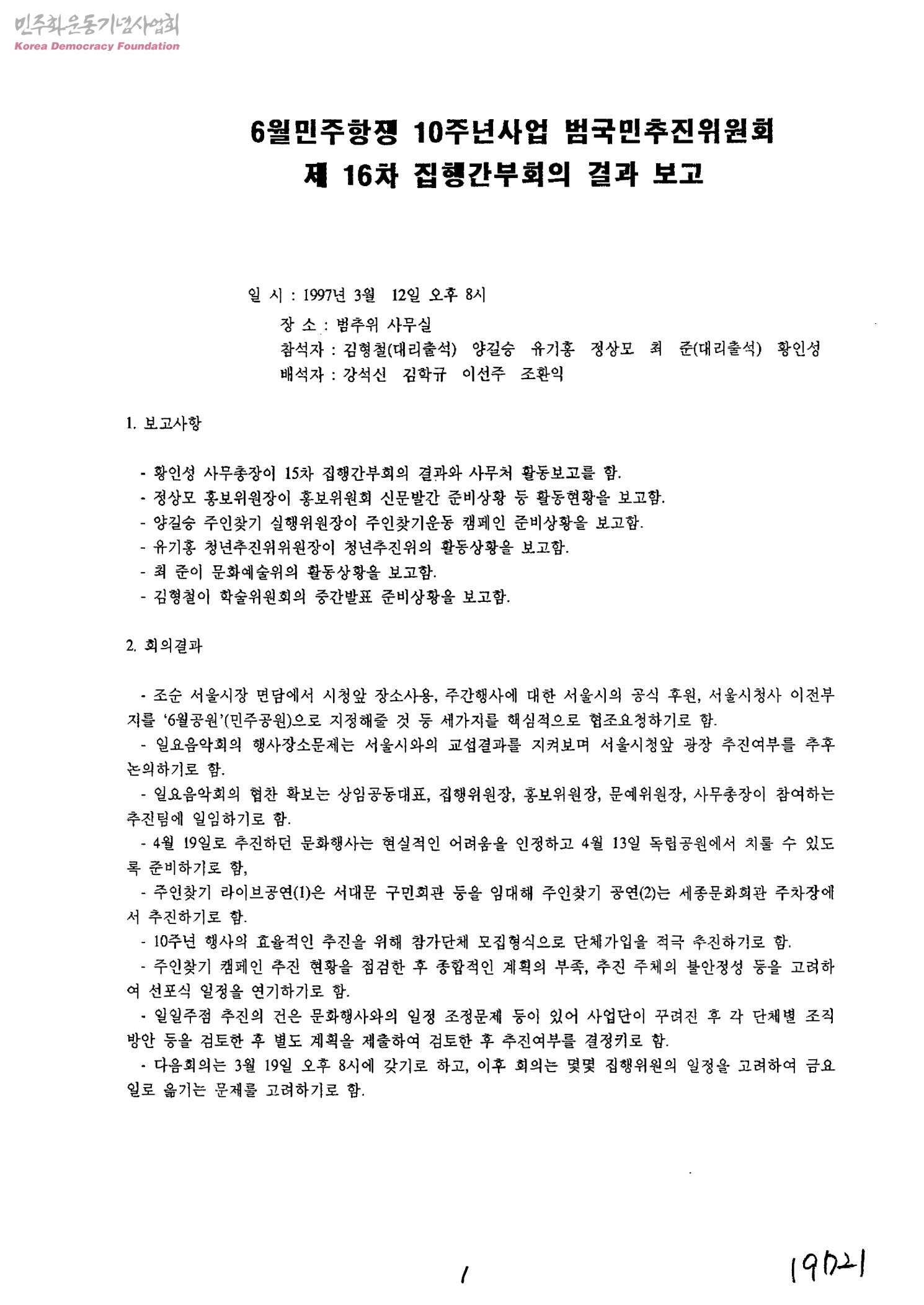 6월민주항쟁 10주년사업 범국민추진위원회 제16차 집행간부회의 결과 보고