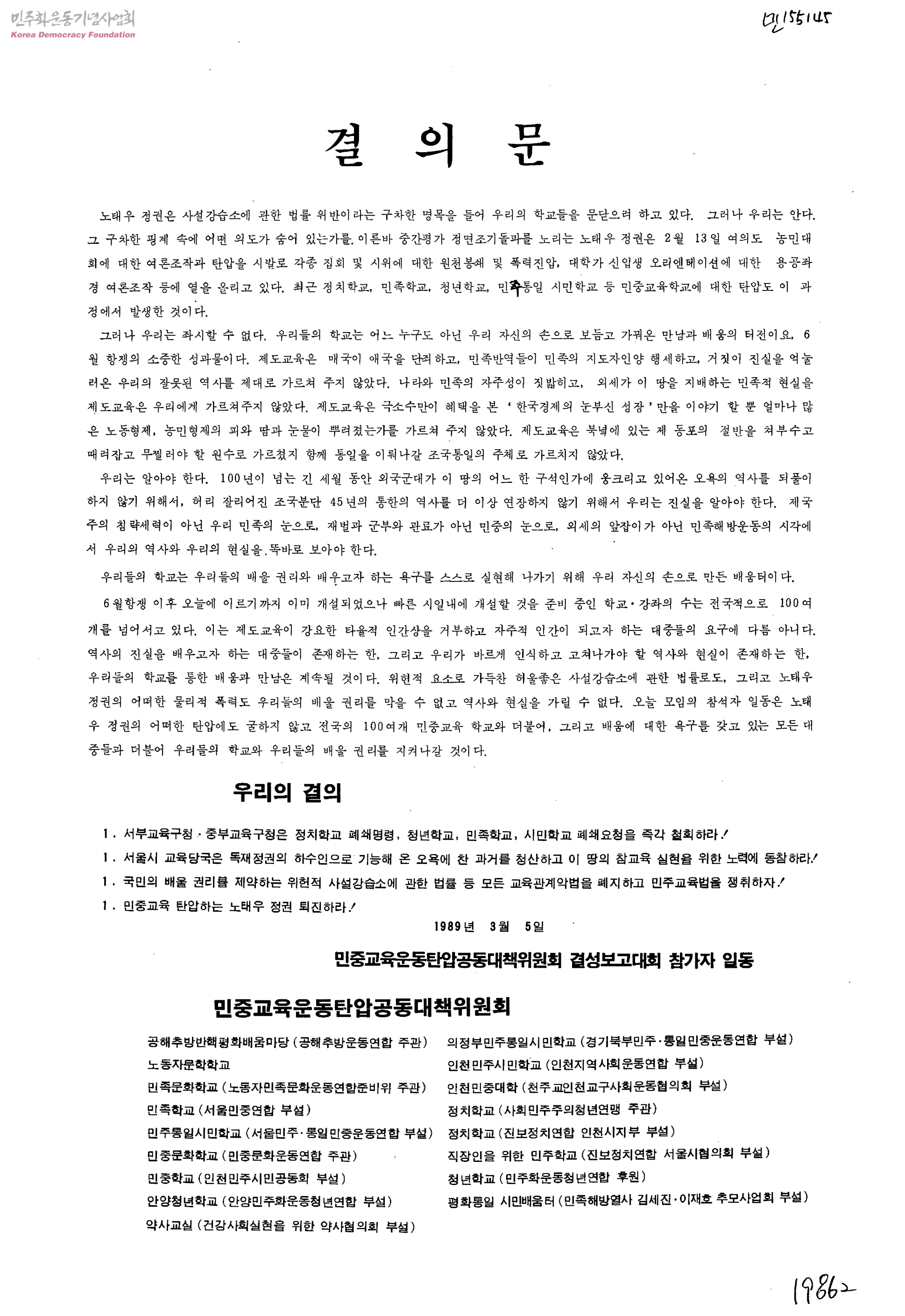 결의문-민중교육학교 탄압 반대