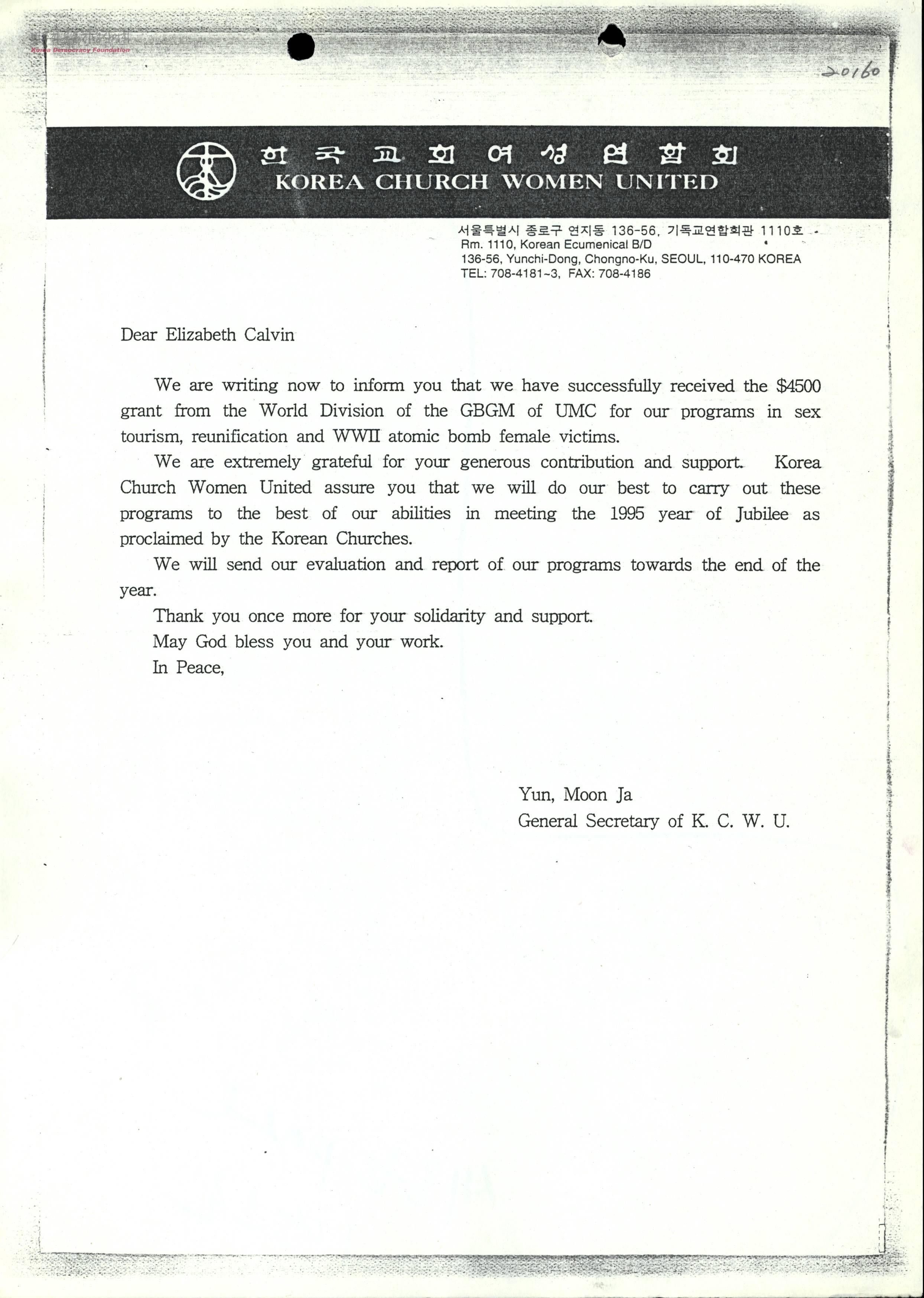 윤문자씨가 Elizabeth Calvin씨에게 보내는 편지 [기생관광, 통일, 2차대전 원자폭탄 피해자를 위한 후원금 수령 확인의 건]