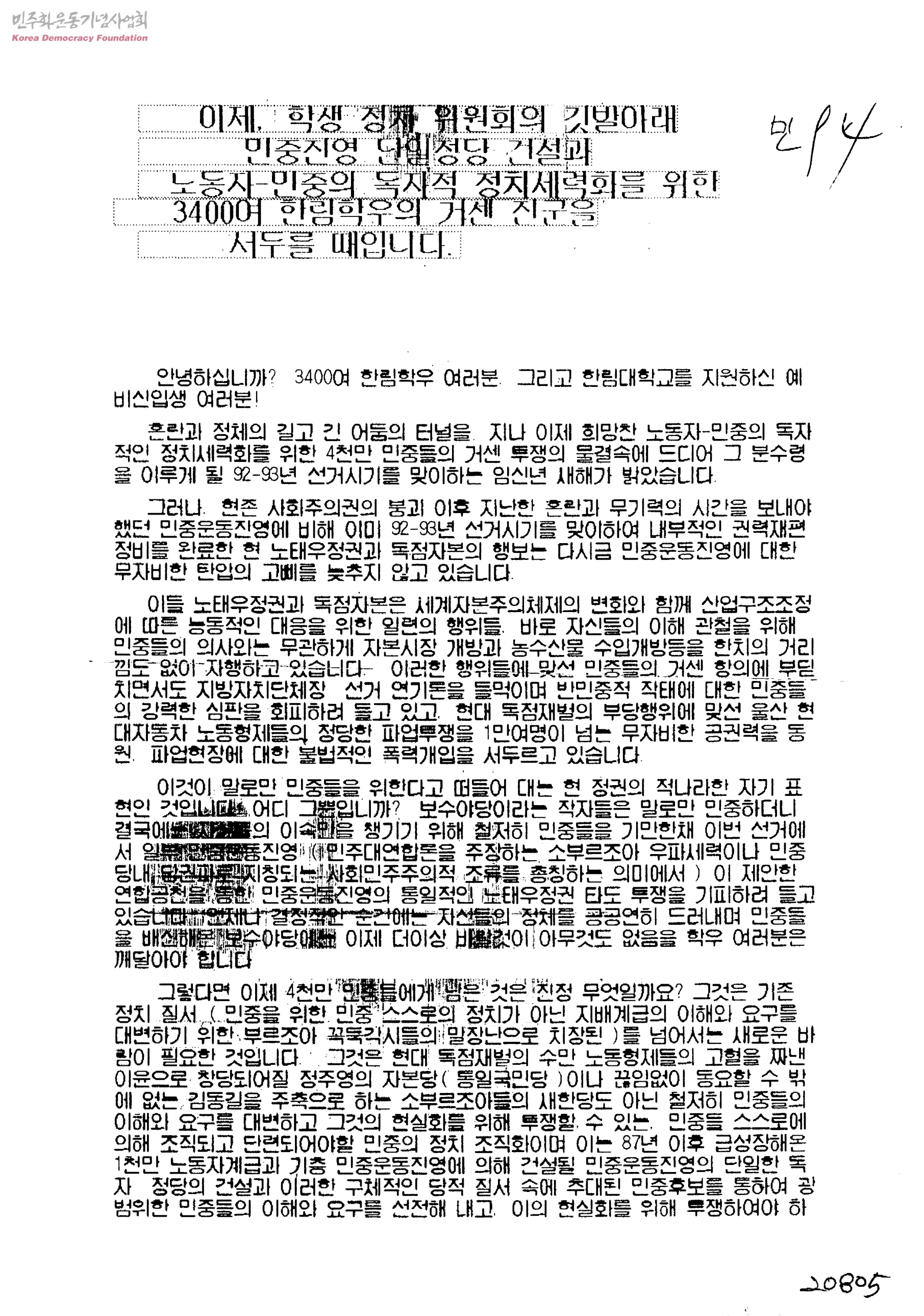 이제, 학생 정치 위원회의 깃발아래 민중진영 단일정당 건설과 노동자-민중의 독자적 정치세력화를 위한 3400여 한림학우의 거센 진군을 서두를 때입니다