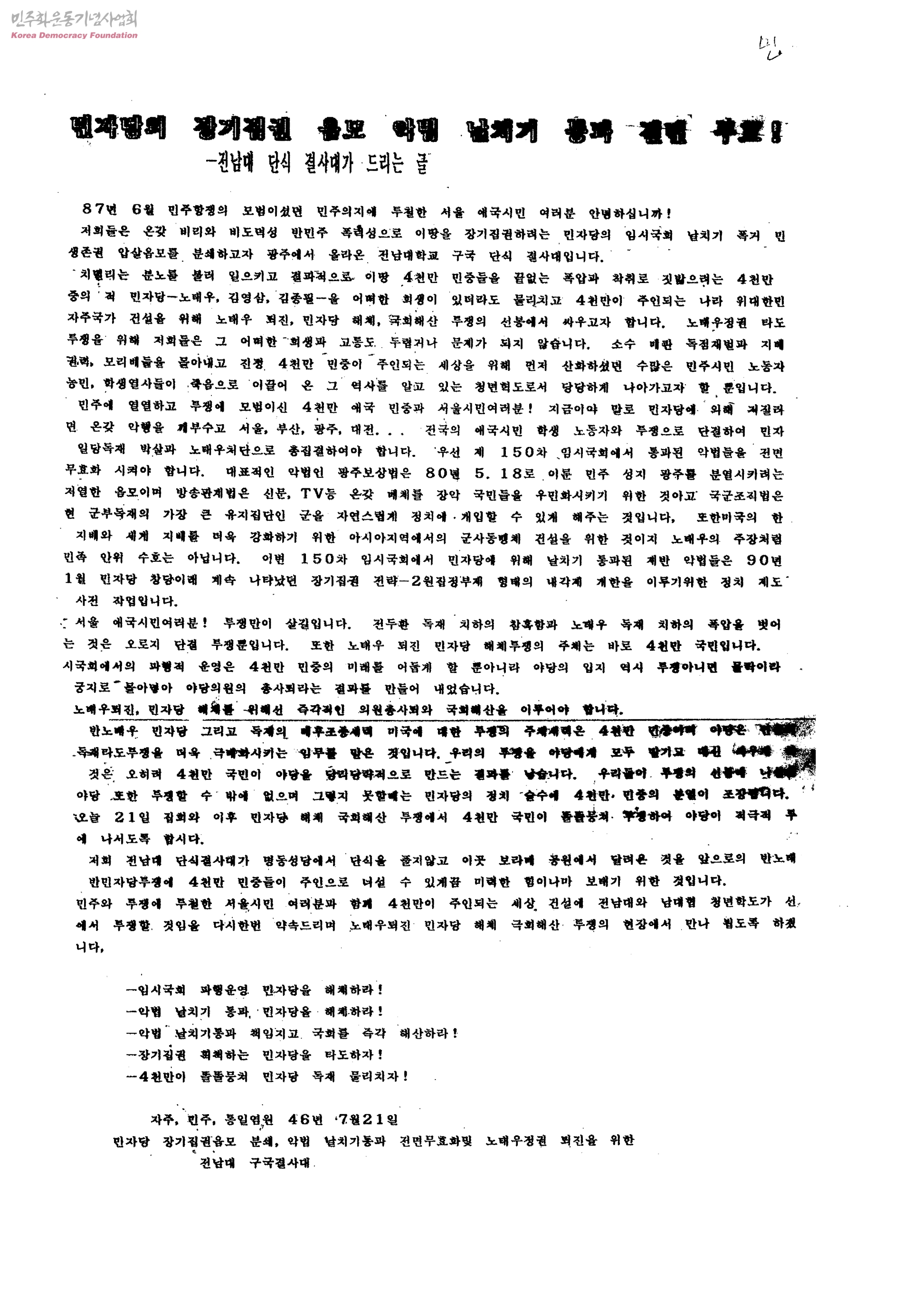 민자당의 장기집권 음모 악법 날치기 통과 전면 무효! -전남대 단식 결사대가 드리는 글