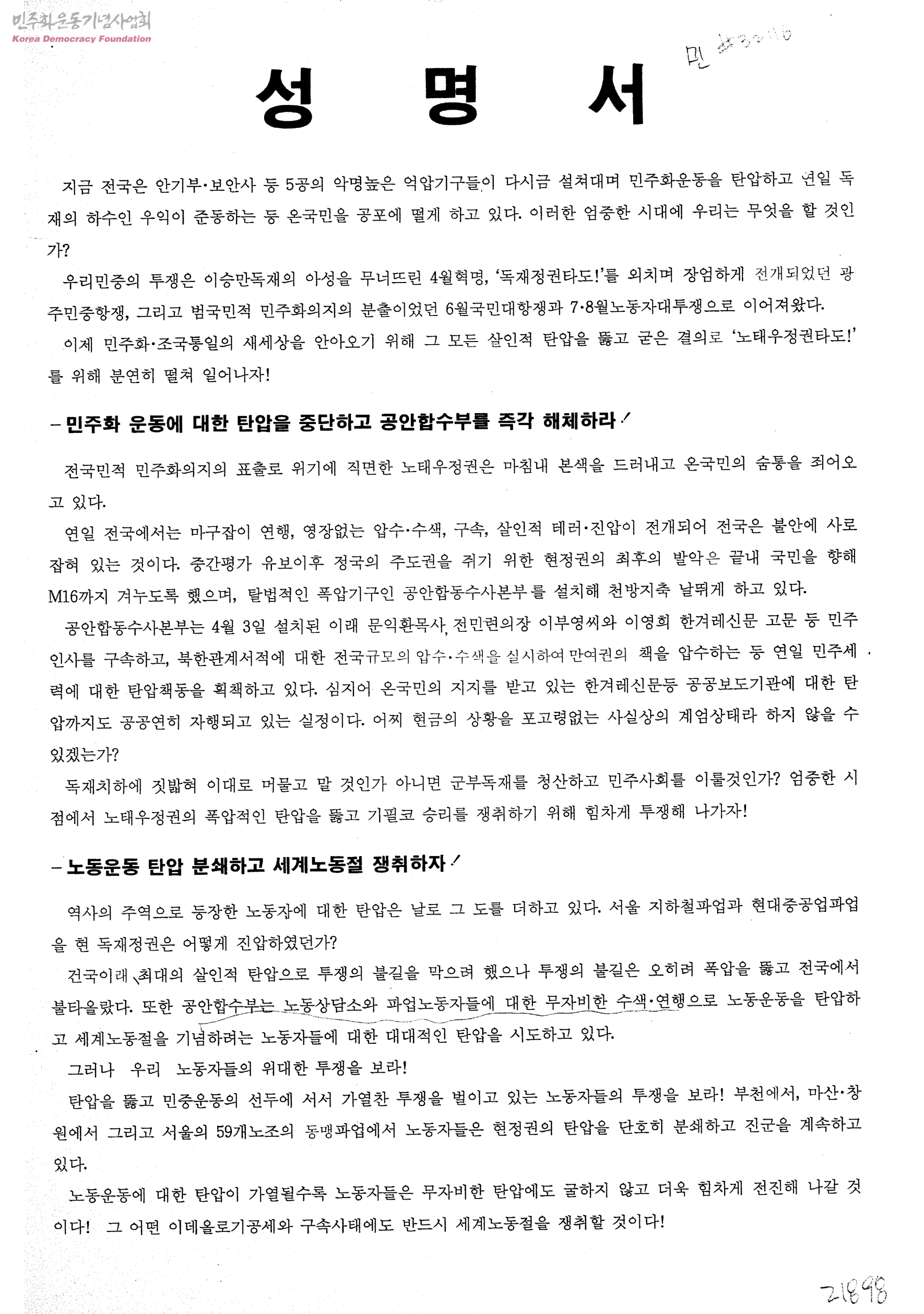 성명서[공안합수부해체하고 노동운동탄압 분쇄]