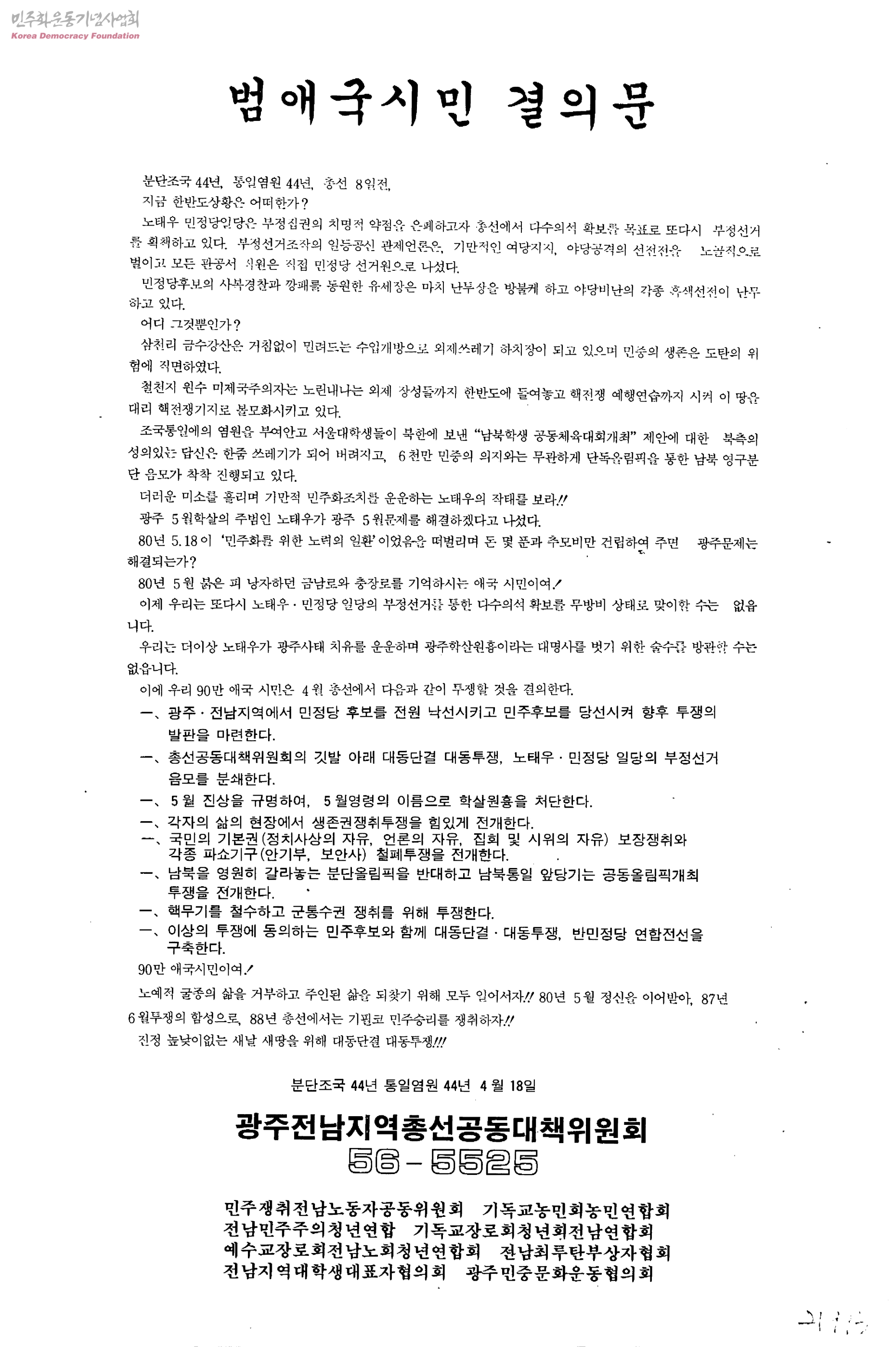 범애국시민 결의문[88년 총선에서의 승리를 위하여]