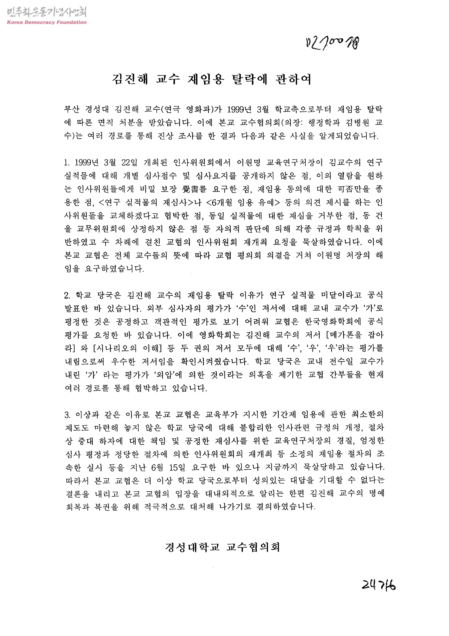 김진해 교수 재임용 탈락에 관하여