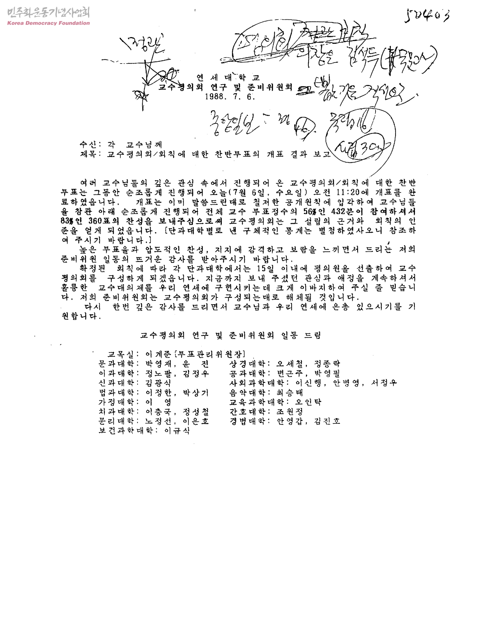 교수평의회/회칙에 대한 찬반투표의 개표 결과 보고[수신:각 교수님께]